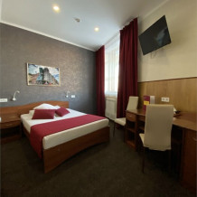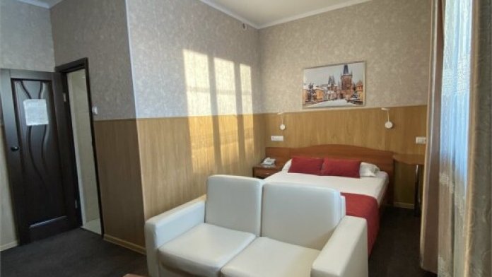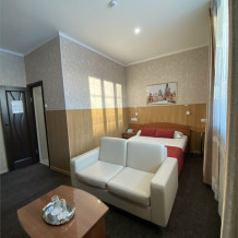 Однокомнатный просторный и комфортабельный номер, площадью 20 кв. м с видом на город. Завтрак включён в стоимость проживания. В номере имеется: 1 двуспальная кровать, кресло-кровать, тумба, холодильник, чайник, фен, мини-прихожая, телевизор, телефон, журнальный столик, ванная, санузел, халаты.