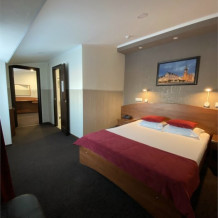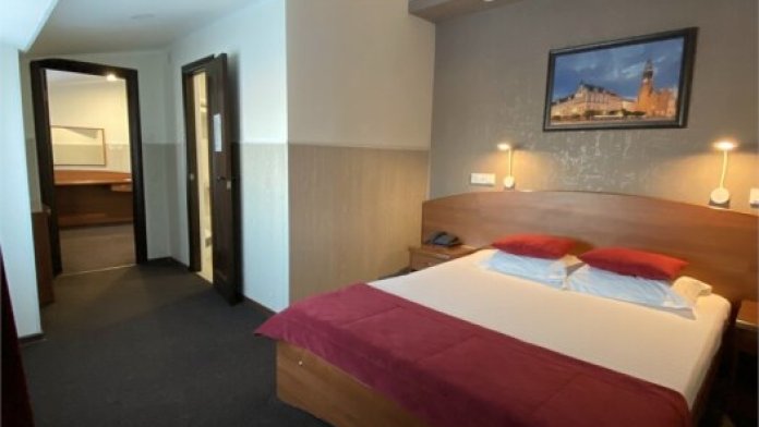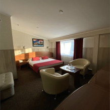 Двухкомнатный просторный и комфортабельный номер, площадью 30 кв. м с видом на город. Завтрак включён в стоимость проживания. В номере имеется: 1 двуспальная кровать, банкетка, 2 кресла, мини бар, гардероб, сейф, письменный стол, 2 тумбы, мини-прихожая, телевизор, телефон, журнальный столик, ванная, санузел, холодильник, чайник, фен, халаты.