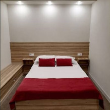Однокомнатный просторный и комфортабельный номер, площадью 16 кв. м с видом на город. Завтрак включён в стоимость проживания. В номере имеется: 1 двуспальная кровать (140*200), тумба, мини-прихожая, телевизор, телефон, холодильник, чайник, фен, журнальный столик, ванная, санузел, халаты.