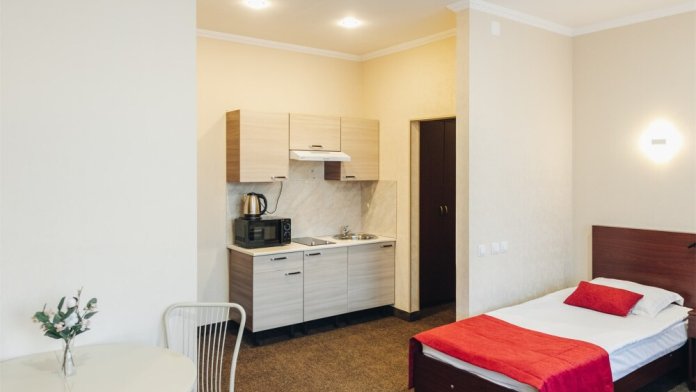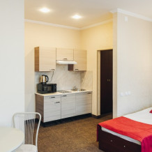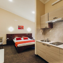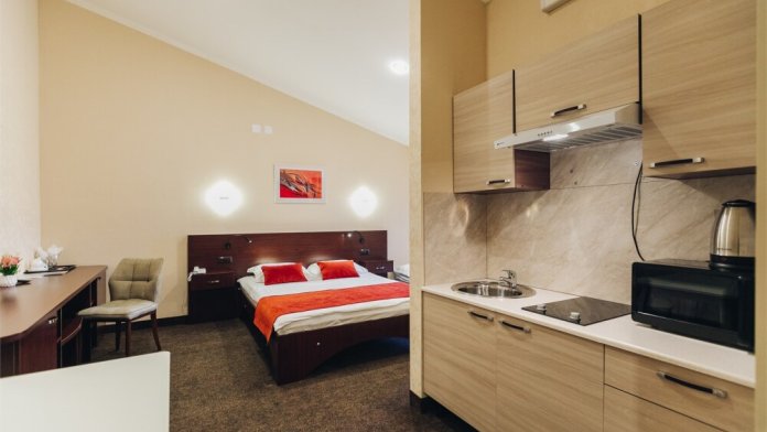 Однокомнатный просторный номер, площадью 30,7 кв.м., разделённый на две зоны: кухонная зона и зона отдыха. В номере имеется 1 двуспальная кровать с изголовьем, 2 тумбы, 2 точечных и 2 прикроватных светильника, письменный стол, журнальный столик, стул, мини холодильник с мини баром, чайник, мини кухня с кухонными принадлежностями, вытяжка, обеденный стол с 2-мя стульями, микроволновая печь, электрическая плита, прихожая с банкеткой, шкаф, телевизор, телефон, ванная комната с санузлом, 2 халата, фен.