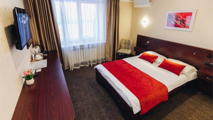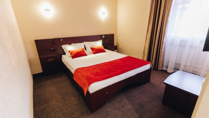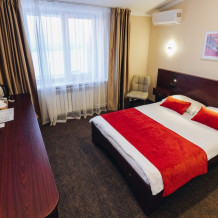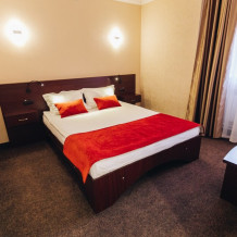 Однокомнатный просторный номер, площадью 18 кв.м. В номере имеется 1 двуспальная кровать с изголовьем, 2 тумбы, 2 точечных и 2 прикроватных светильника, письменный стол, журнальный столик, стул, мини холодильник с баром, чайник, прихожая с банкеткой, шкаф, телевизор, телефон, ванная комната с санузлом, 2 халата, фен.