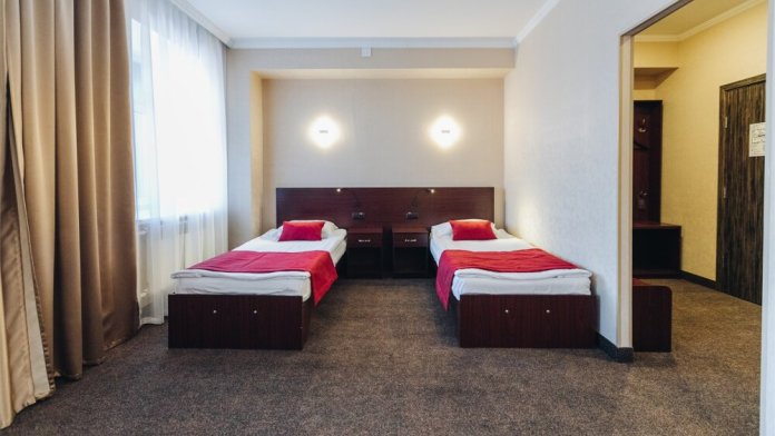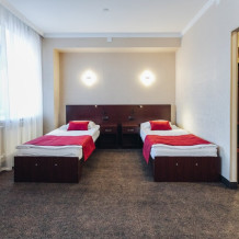 Однокомнатный просторный номер, площадью 18 кв.м. В номере имеется 2 односпальные кровати с изголовьем, 2 тумбы, 2 точечных и 2 прикроватных светильника, письменный стол, журнальный столик, стул, мини холодильник с баром, чайник, прихожая с банкеткой, шкаф, телевизор, телефон, ванная комната с санузлом, 2 халата, фен