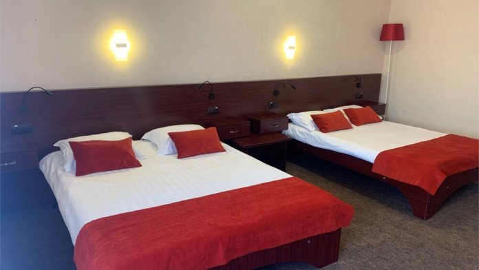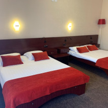 Однокомнатный просторный номер, площадью 22 кв.м. с 2-мя двуспальными кроватями. В номере имеются 2 тумбы, светильники-бра, телевизор, мини бар, чайник, фен, телефон, шкаф, багажница. Есть ванная комната с санузлом.