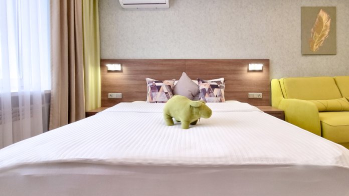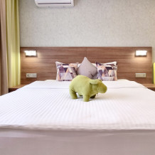Апартаменты представляют собой просторный номер с двуспальной кроватью King size (или двумя односпальными, по запросу), удобнейшим диваном-кроватью. В апартаментах имеется оборудованная всем необходимым кухня, балкон, гладильный комплекс, система кондиционирования. Комфорт высочайшего уровня и продуманные до мелочей детали.
