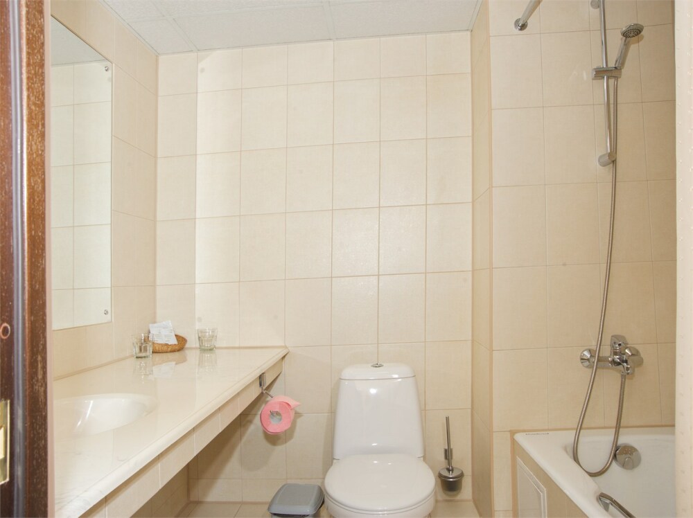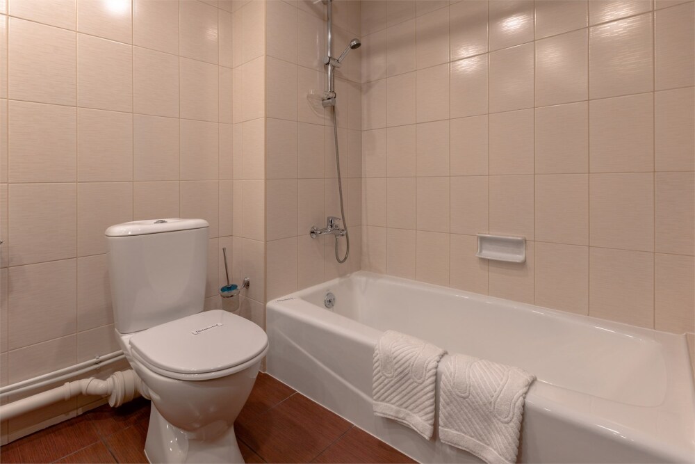 1 ванная комната: ванна, душ, раковина, биде, туалет, фен, туалетные принадлежности, халаты, тапочки.