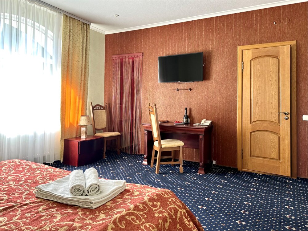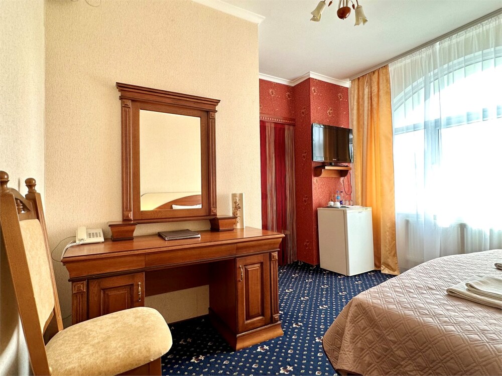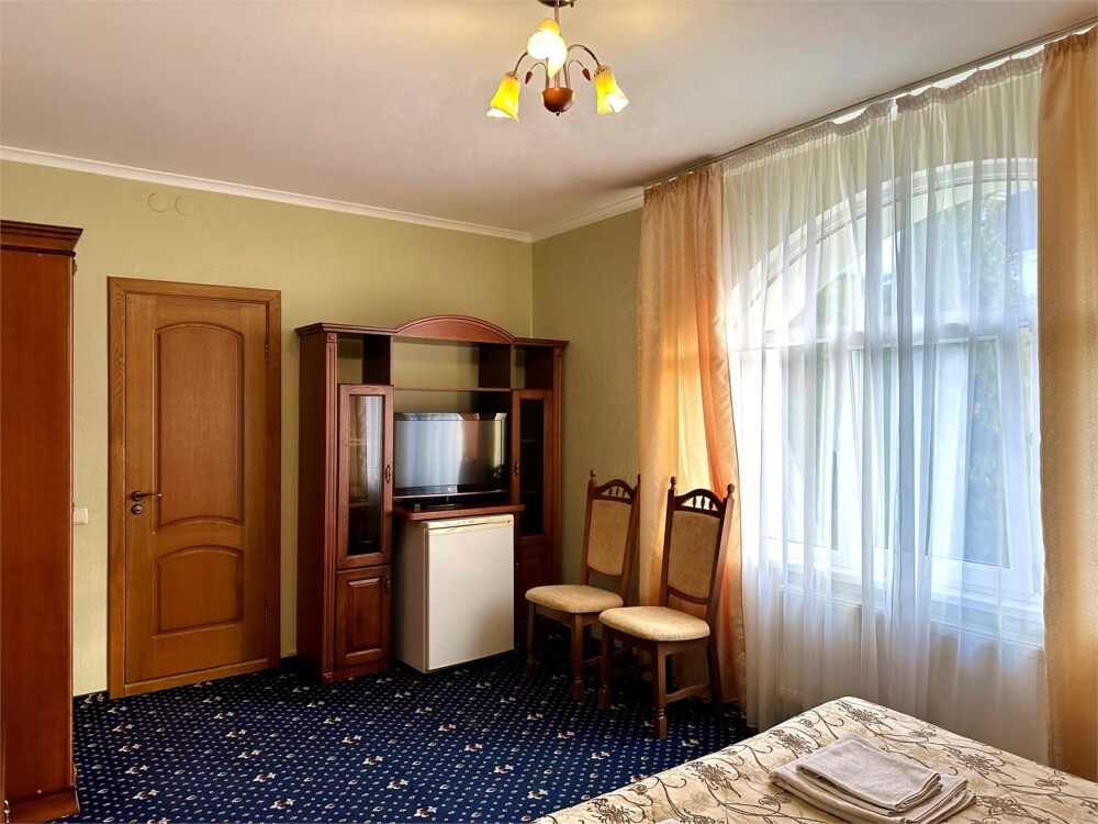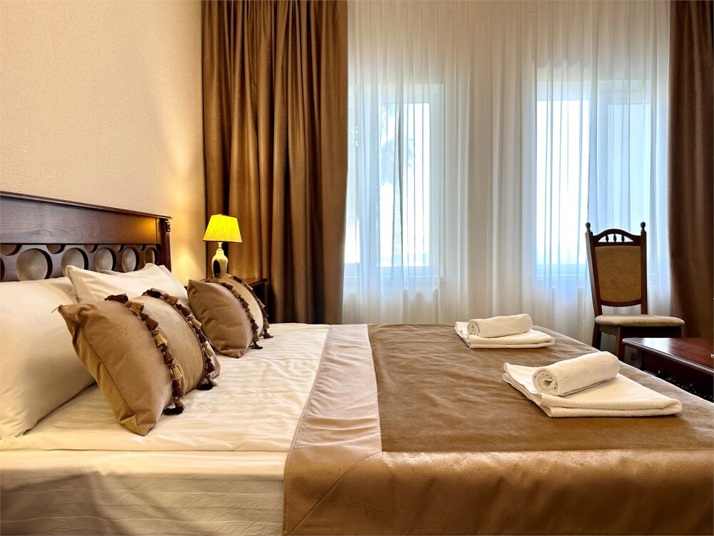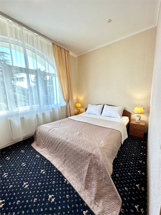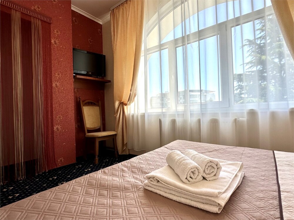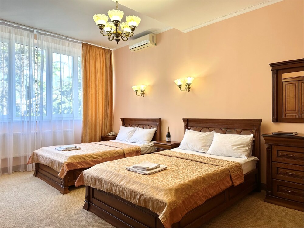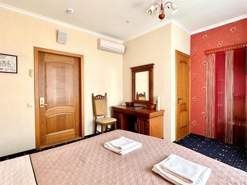 Комплектация номера: плоский телевизор, кондиционер, холодильник, фен, тапочки, халат, полотенца (банные и пляжные), жидкое мыло, гель д/душа, туалетная бумага, освежитель воздуха.
