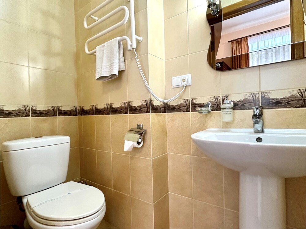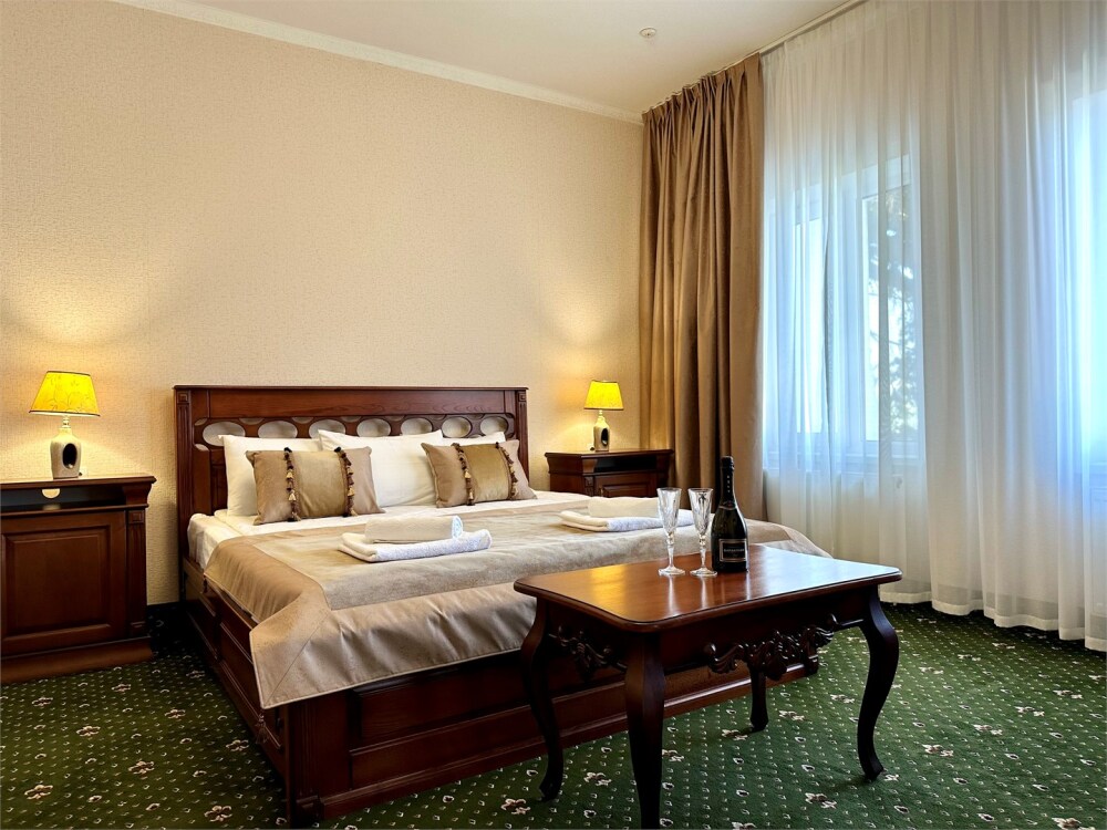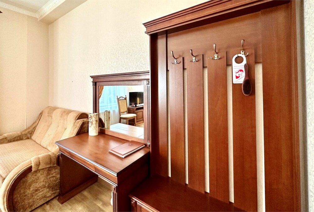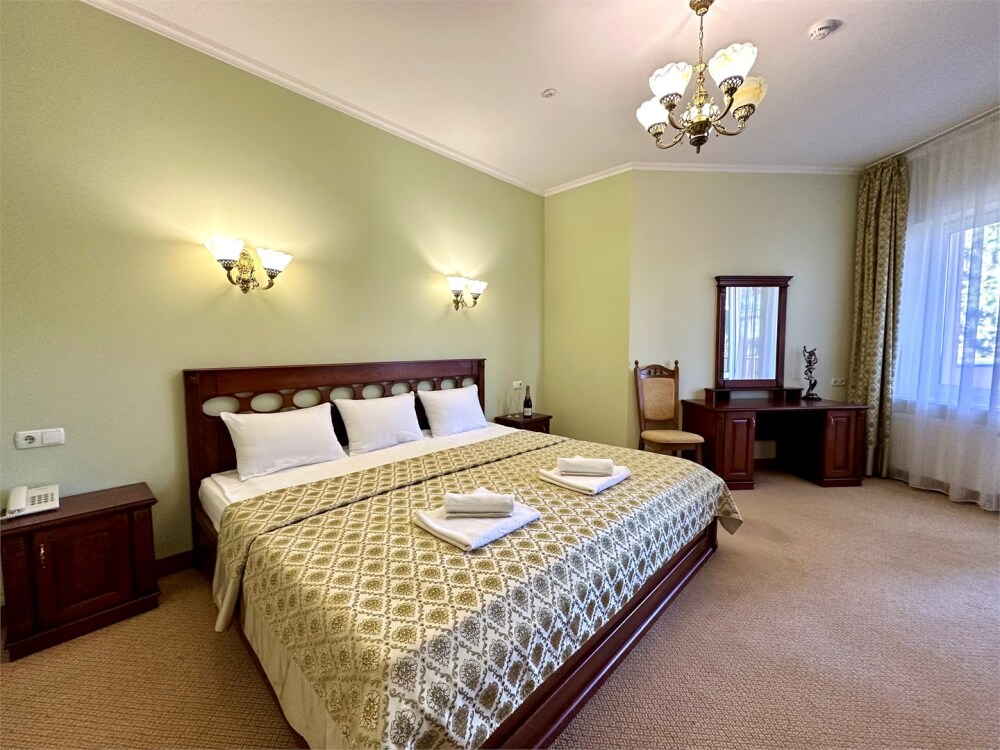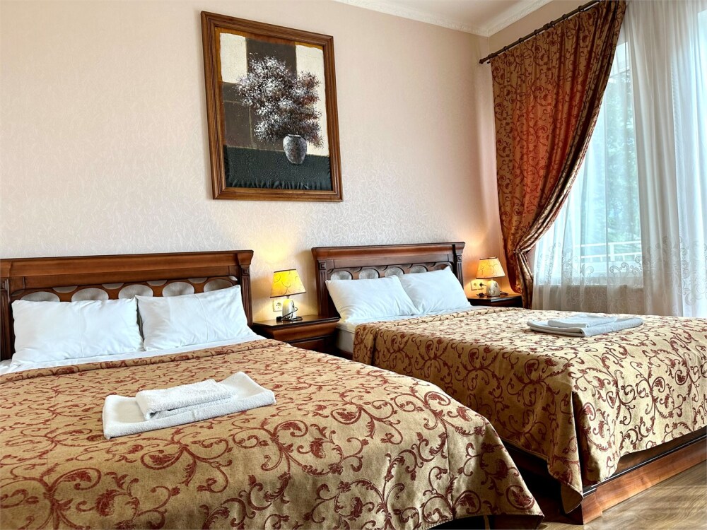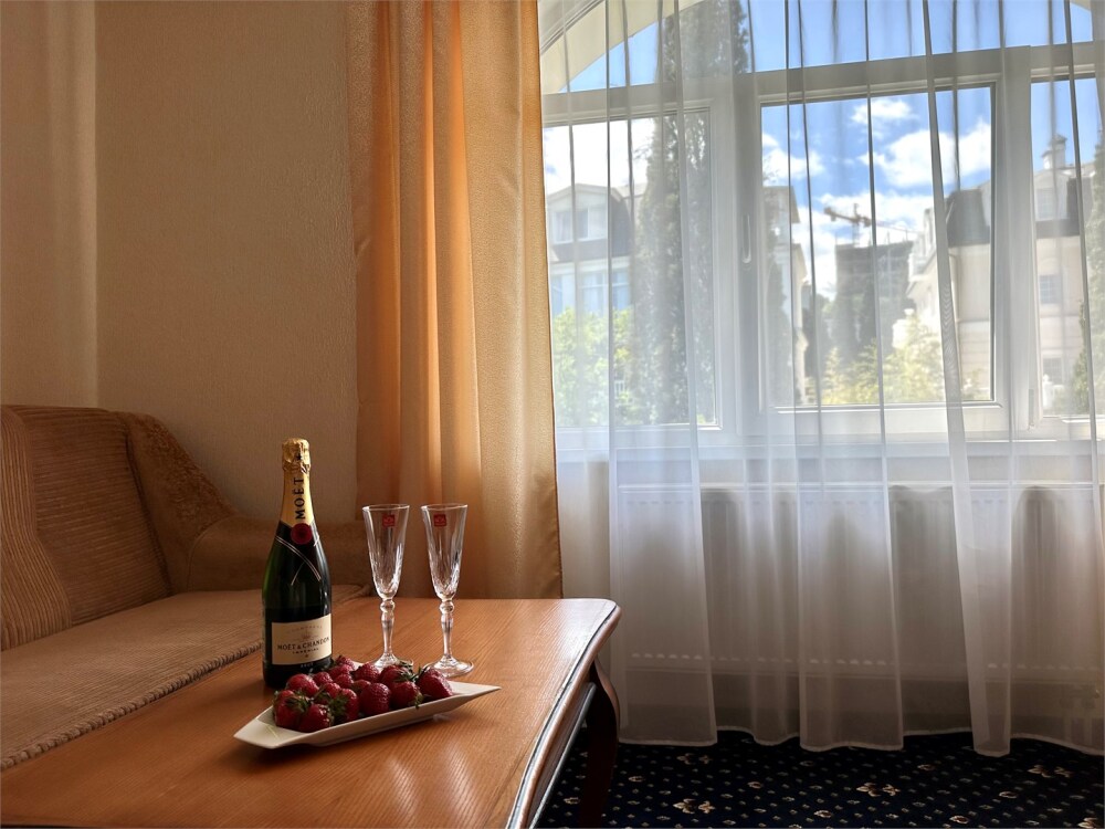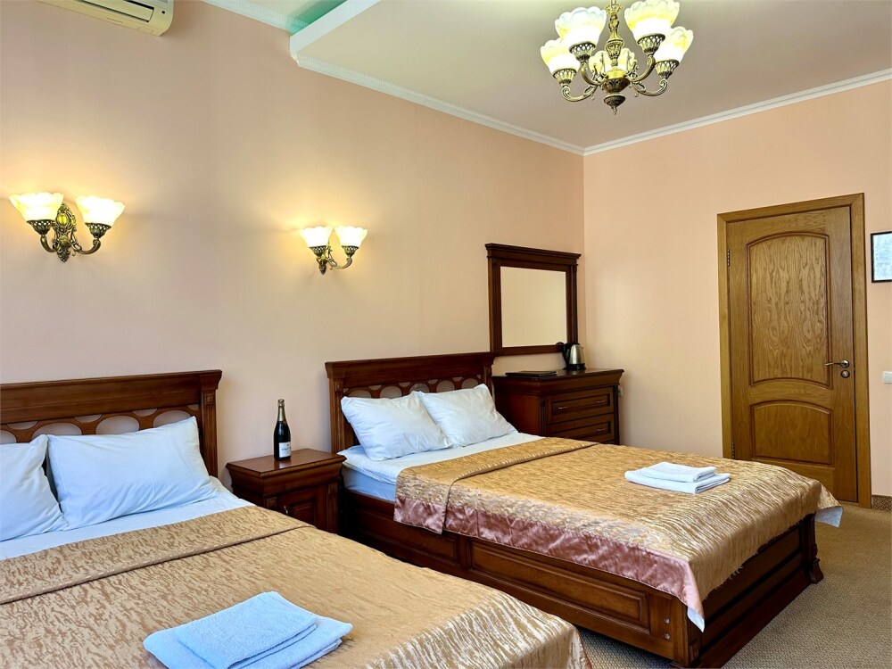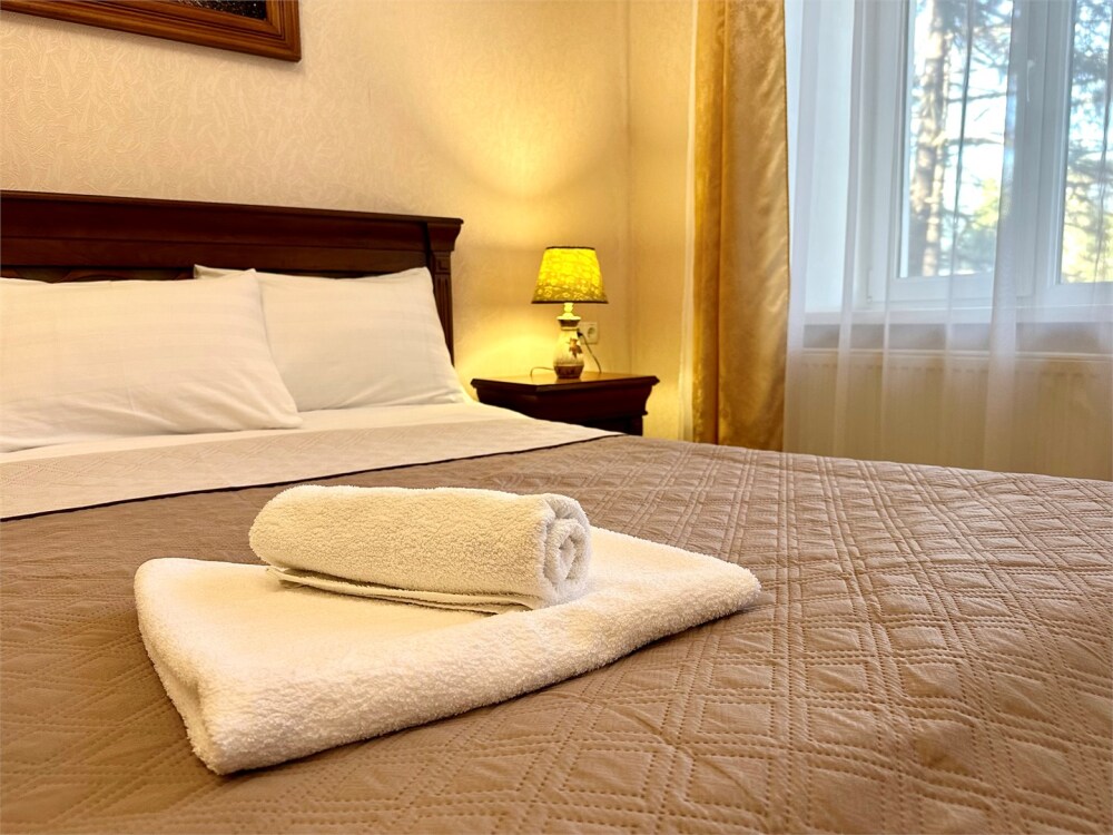 Комплектация номера: плоский телевизор, кондиционер, холодильник, фен, тапочки, халат, полотенца (банные и пляжные), жидкое мыло, гель д/душа, туалетная бумага, освежитель воздуха.