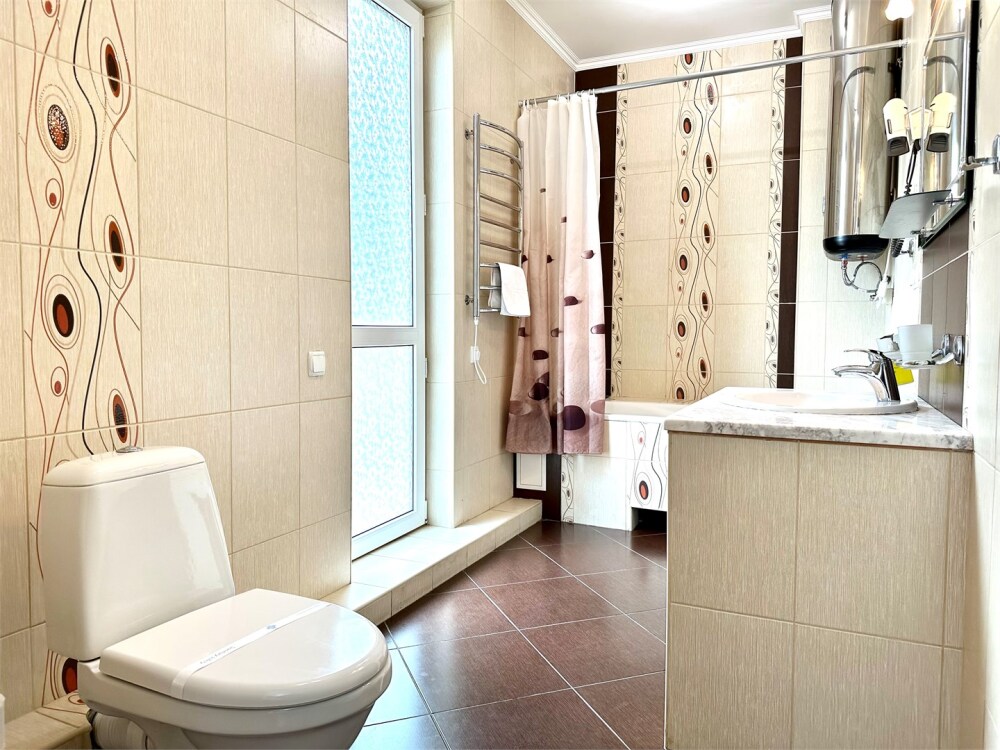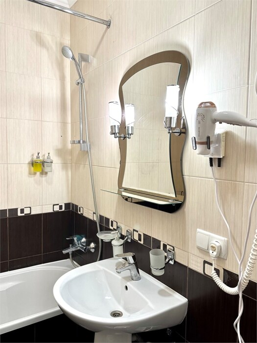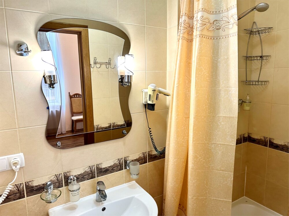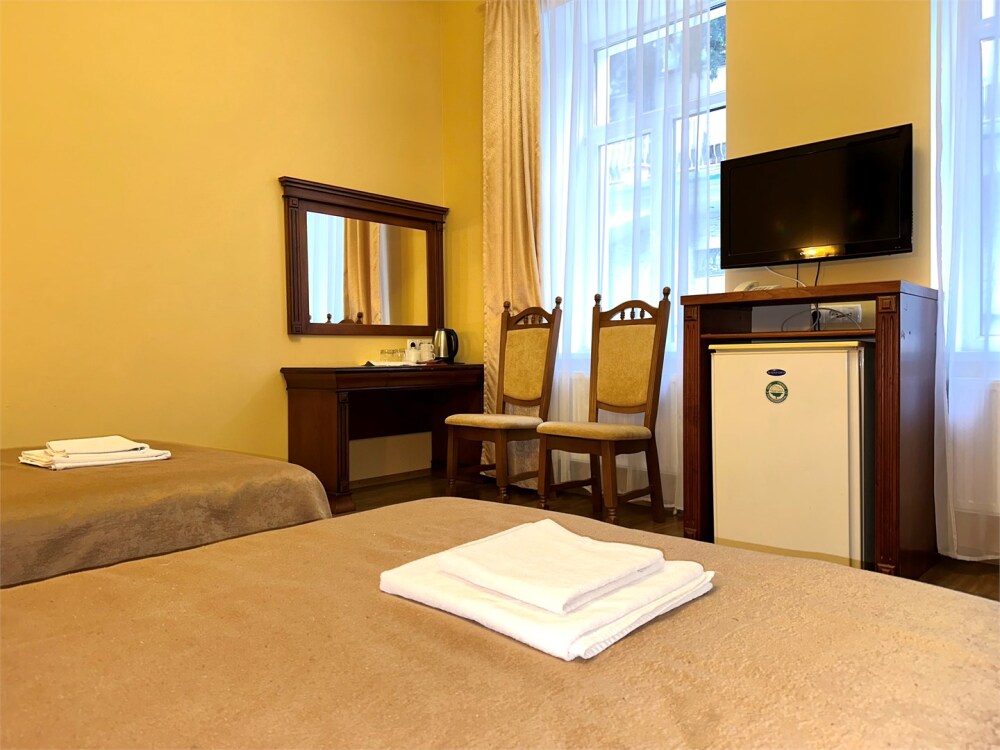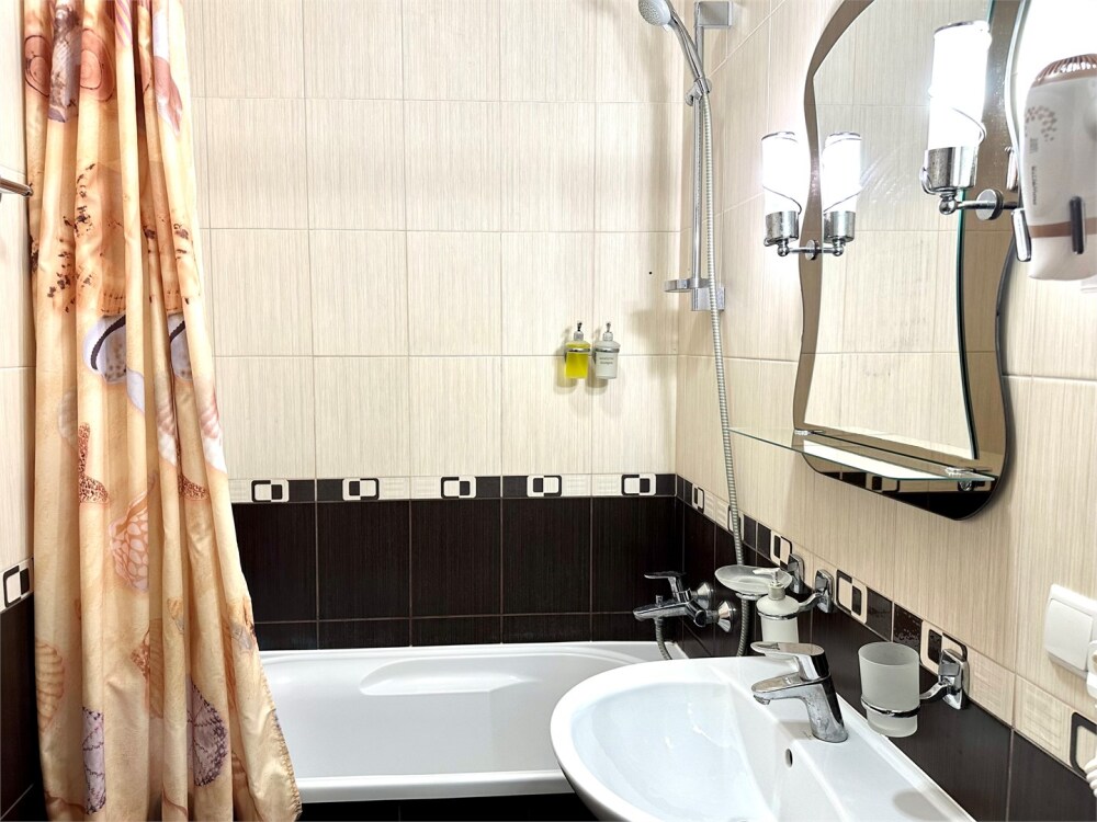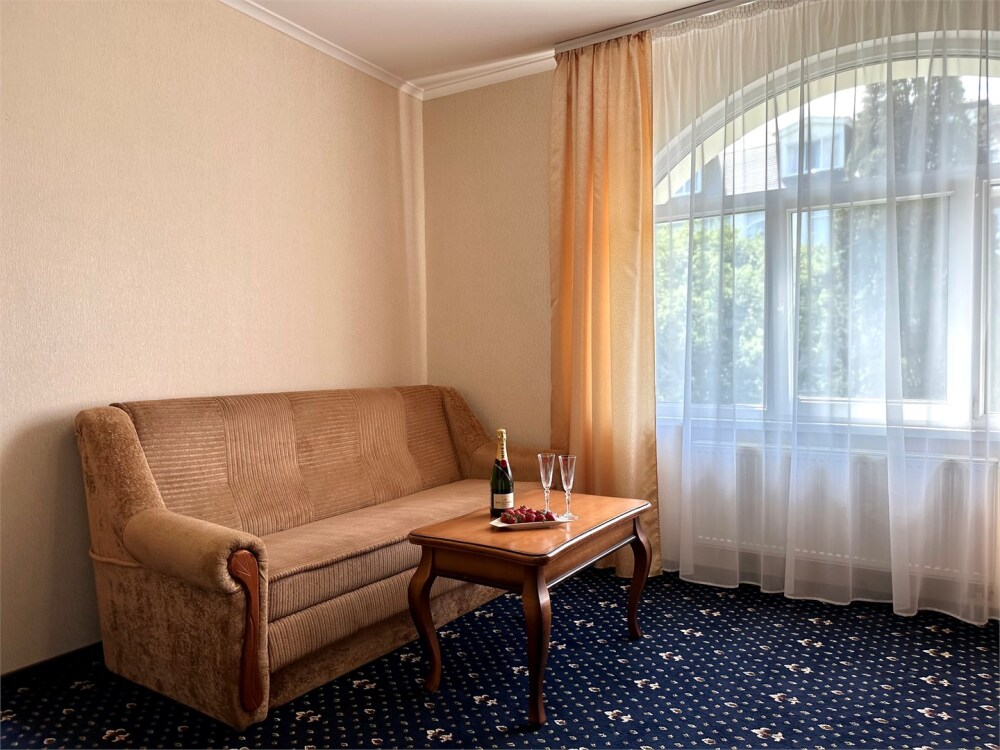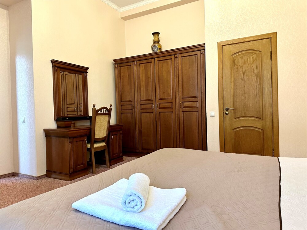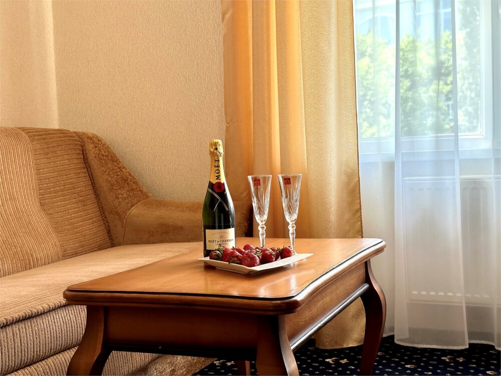 Комплектация номера: плоский телевизор, кондиционер, холодильник, фен, тапочки, халат, полотенца (банные и пляжные), жидкое мыло, гель д/душа, туалетная бумага, освежитель воздуха.