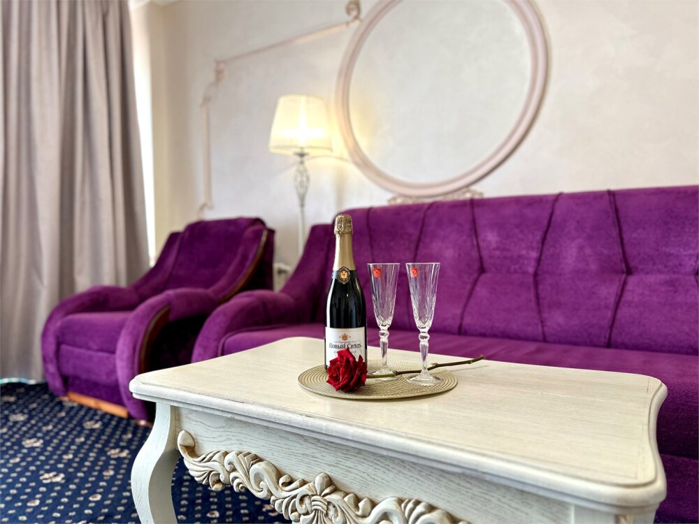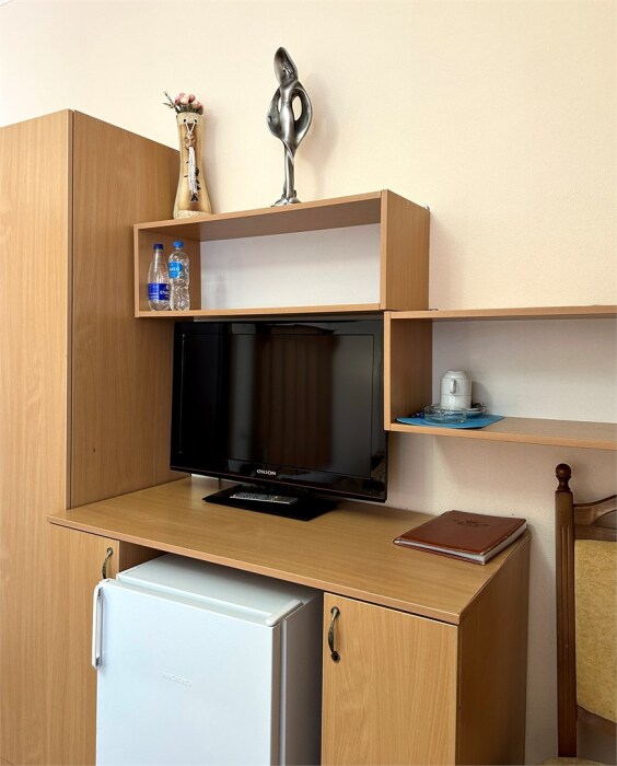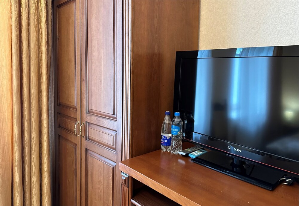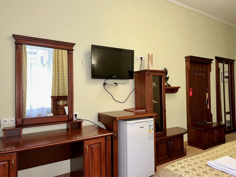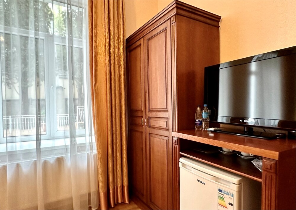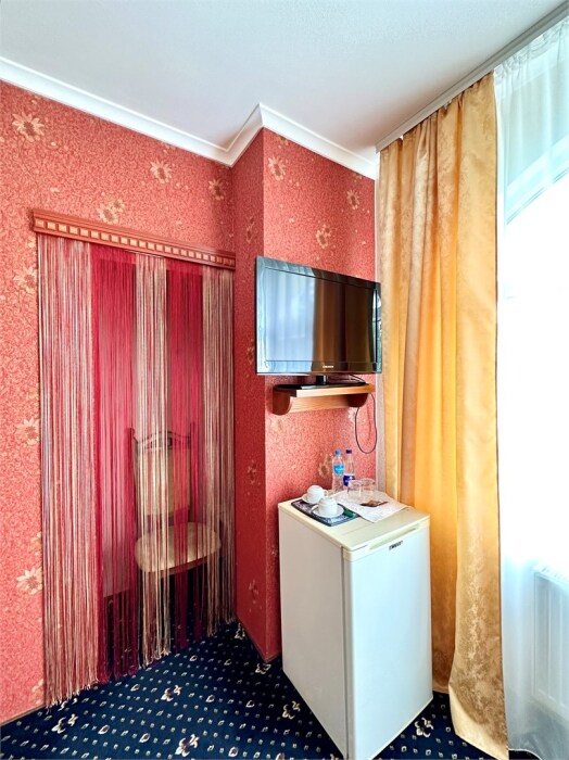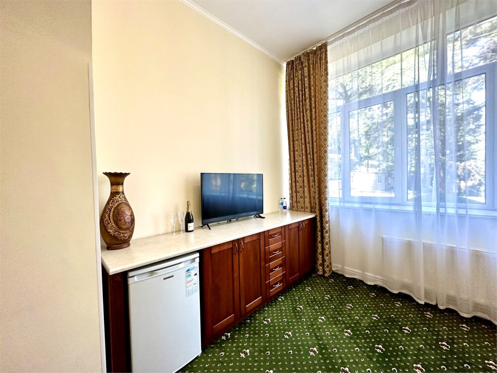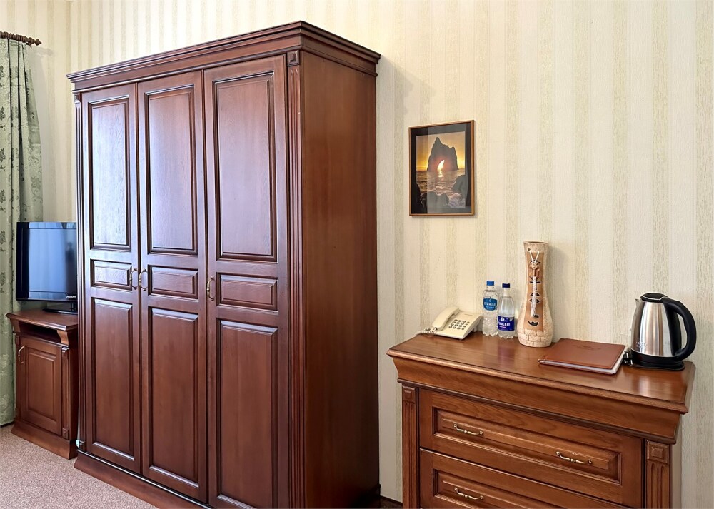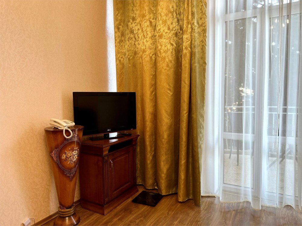 Комплектация номера: плоский телевизор, кондиционер, холодильник, фен, тапочки, халат, полотенца (банные и пляжные), жидкое мыло, гель д/душа, туалетная бумага, электрочайник, освежитель воздуха.