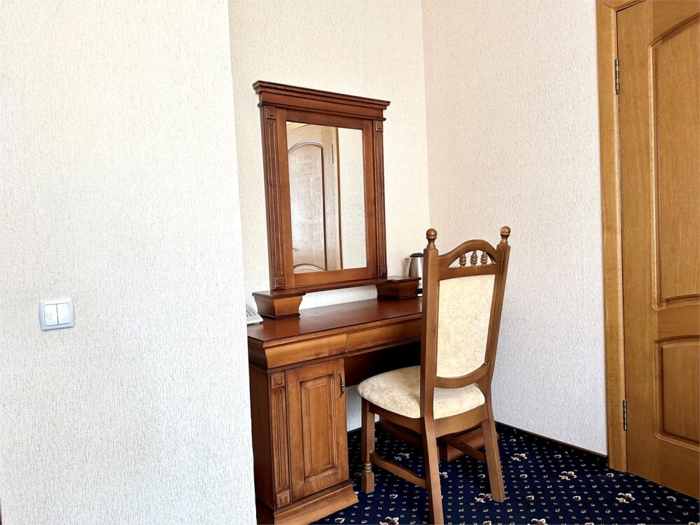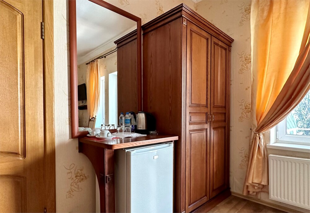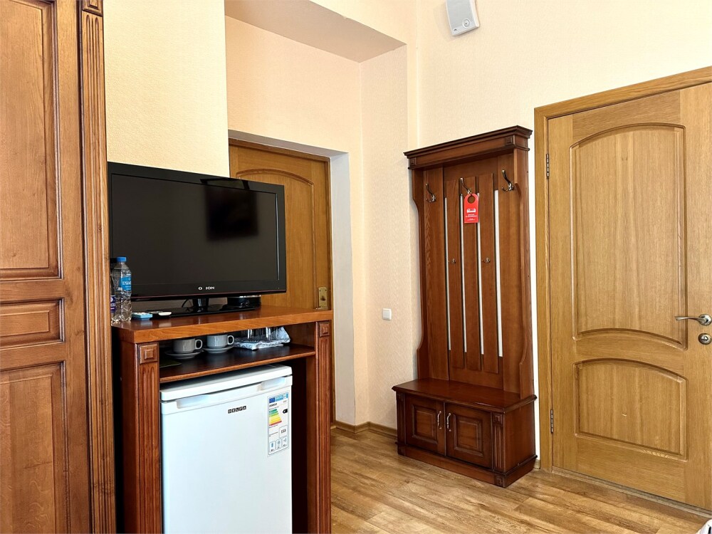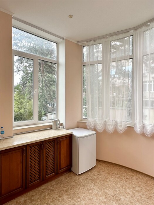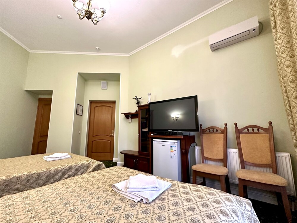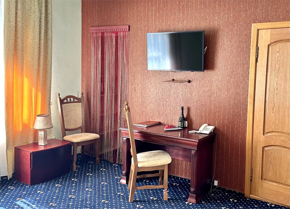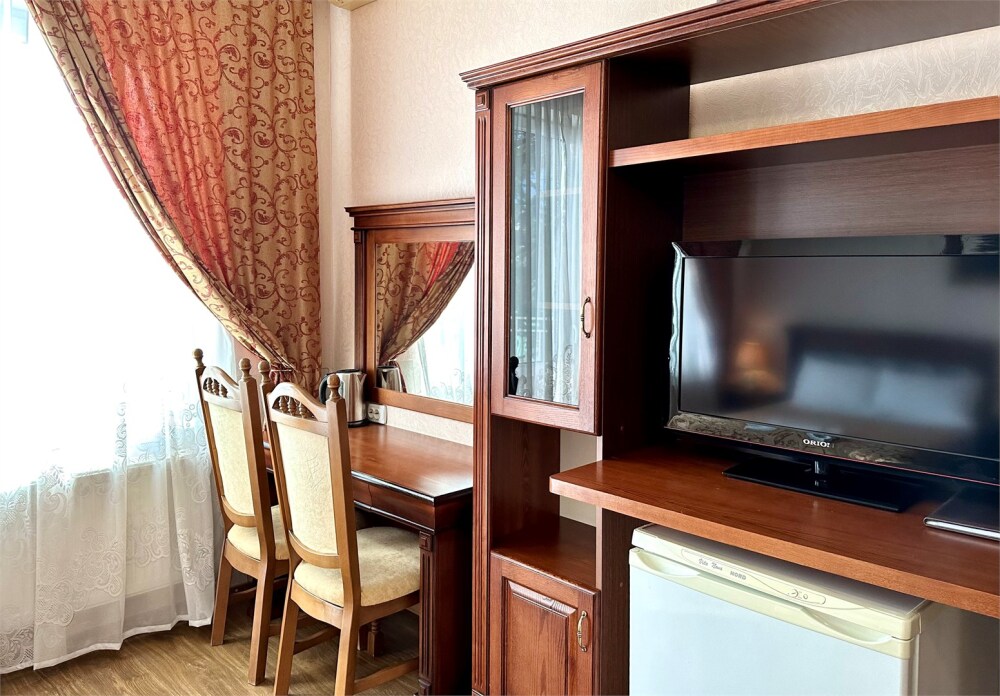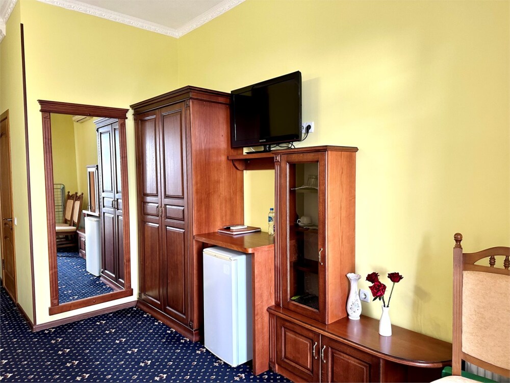 Комплектация номера: плоский телевизор, кондиционер, холодильник, фен, тапочки, халат, полотенца (банные и пляжные), жидкое мыло, гель д/душа, туалетная бумага, электрочайник, освежитель воздуха.