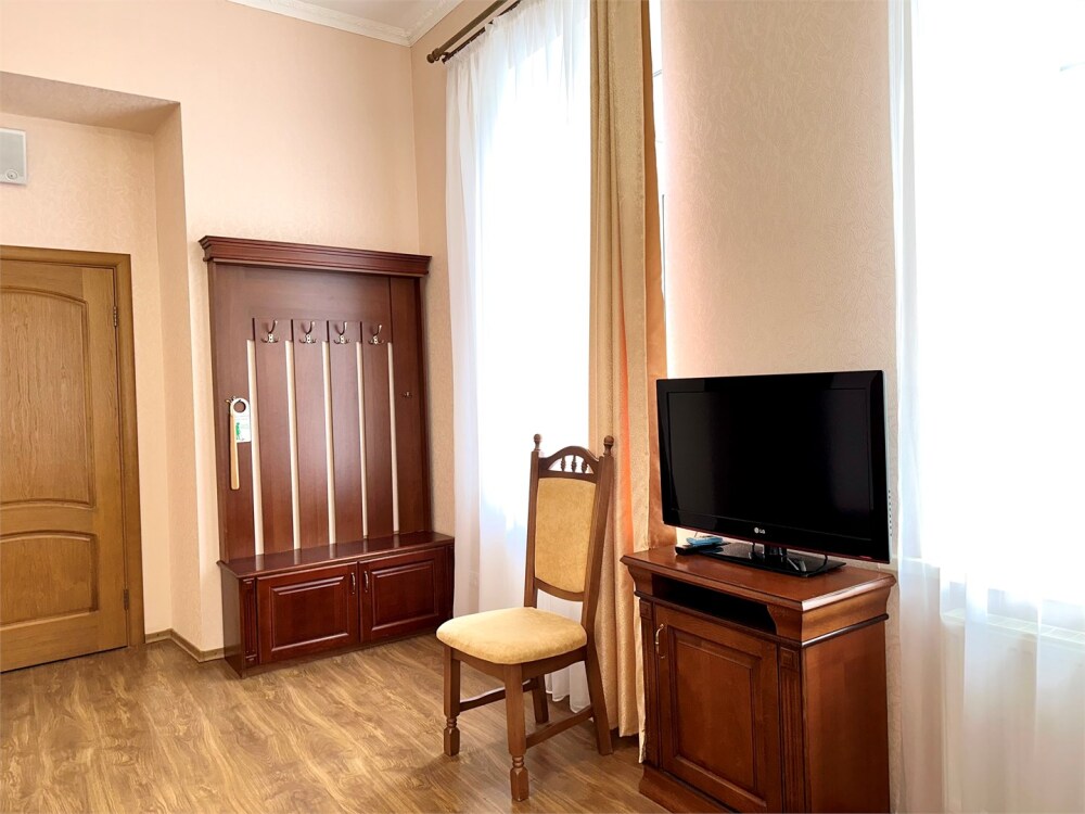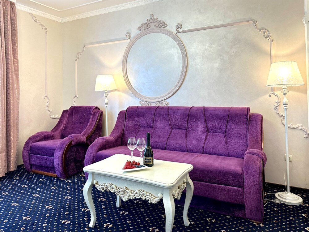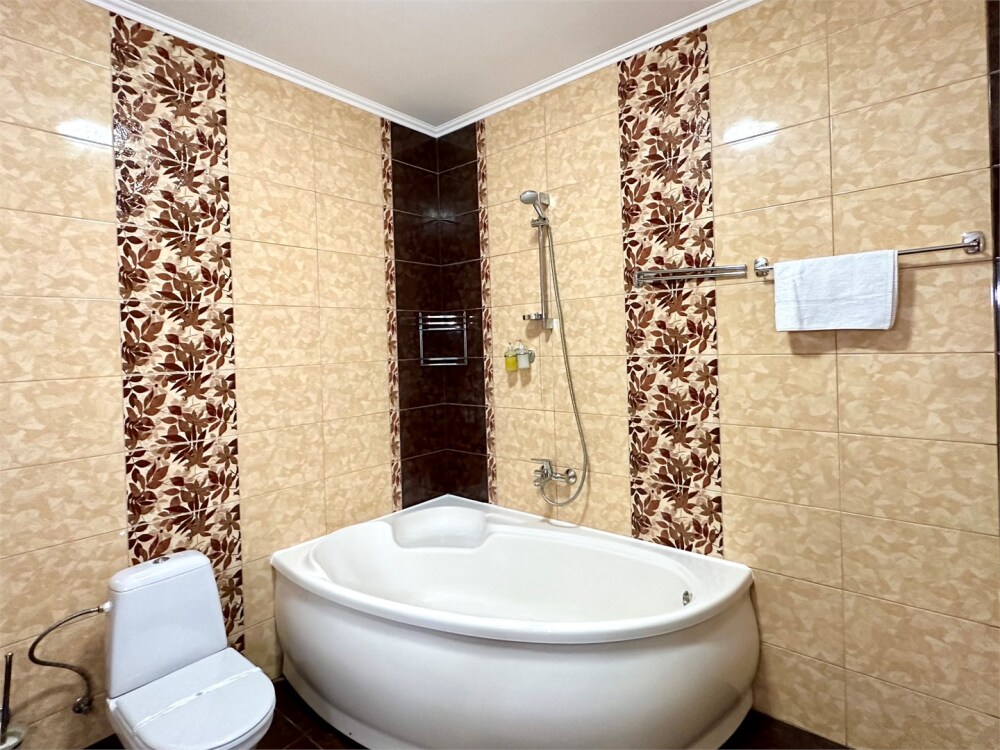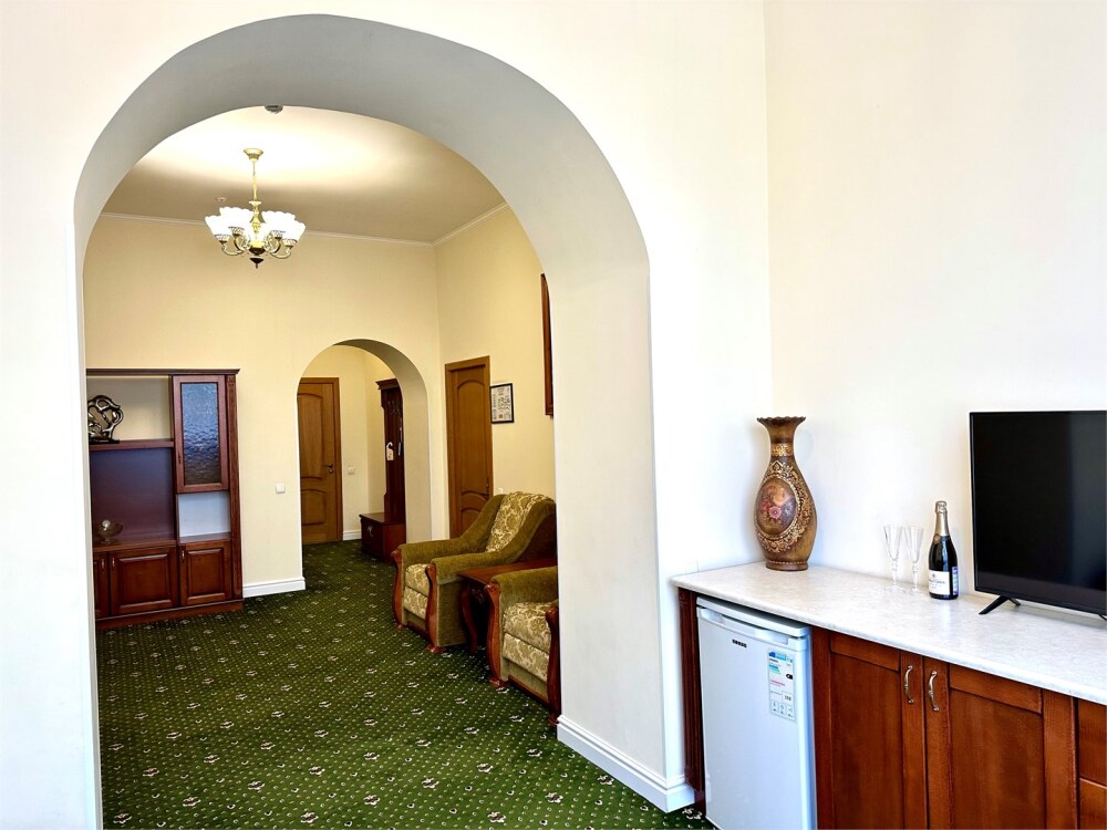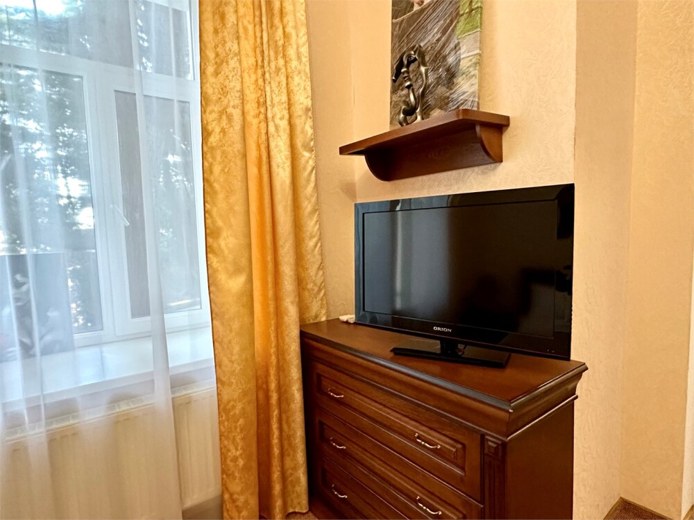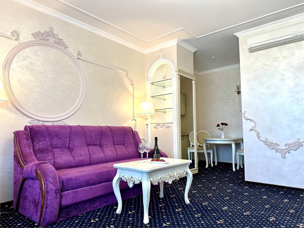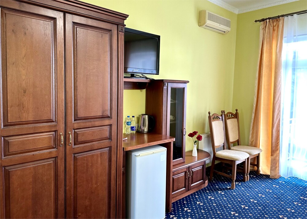 Комплектация номера: плоский телевизор, кондиционер, холодильник, фен, тапочки, халат, полотенца (банные и пляжные), жидкое мыло, гель д/душа, туалетная бумага, электрочайник, освежитель воздуха.
