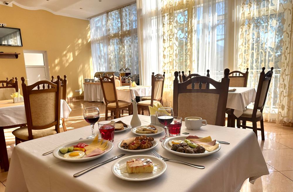 На территории отеля находятся 2 бара и ресторан с банкетными залами, готовыми принять от 20 до 100 гостей, открытой террасой с видом на Ялту и VIP-верандой. Каждое утро в ресторане отеля Вас с нетерпением ждет радушный персонал, большое количество свежих и горячих блюд, лёгкая музыка и атмосфера домашнего уюта. Питание по системе «шведский стол» и «a-la-carte», заказ блюд по меню в номер с доставкой. Проводим банкеты, фуршеты и свадебные торжества.