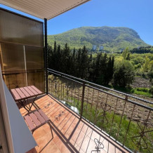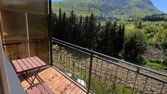 Квартира-студия с хорошим ремонтом и открытым балконом с видом на Медведь-гору в новострое в крайнем доме от моря. Таких студий одинаковых в доме две, на одном этаже, напротив друг друга, удобно приезжать двумя парами, все рядом, но при этом, каждая пара отдельно, со своей отдельной кухней и своим санузлом