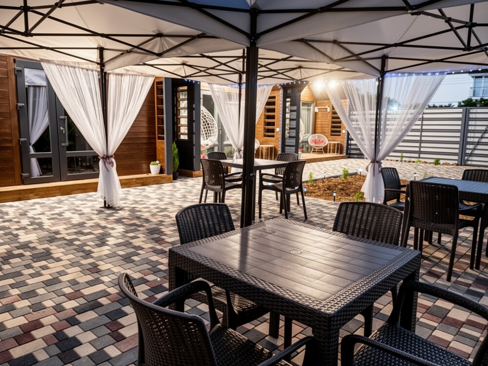 Зона с шатрами оборудована всем необходимым для приема пищи: 4 комплекта уличных столов со стульями, пол выложен брусчатым кирпичом, вечерняя подсветка для уютного вечера.