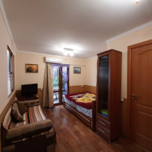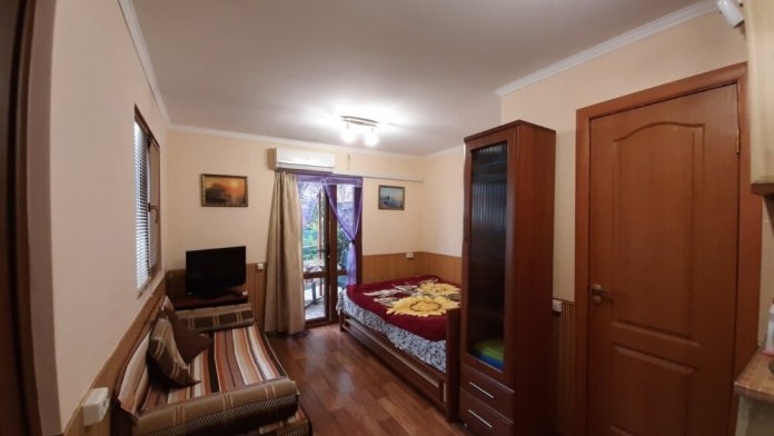 Студия вместимостью до 4-х человек, оснащёна всем необходимым: мини-кухня, эл. плитка, микроволновка, эл. чайник, посуда, душ, сан. узел, кондиционер, спутниковое тв, плазменный телевизор, мебель, интернет. Есть два места для стоянки авто, место для шашлыка и барбекю.