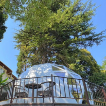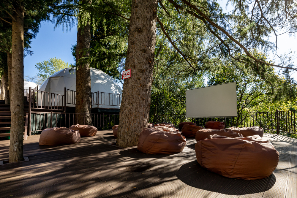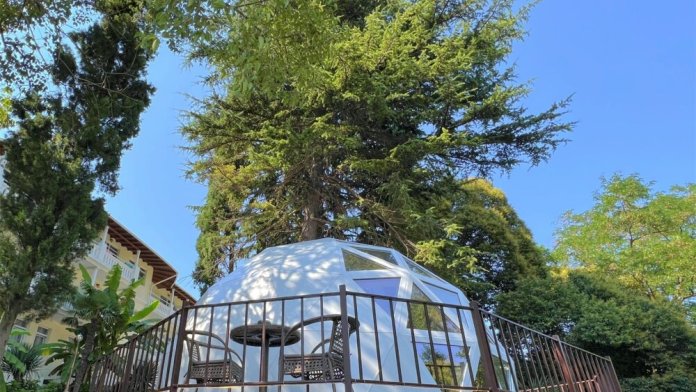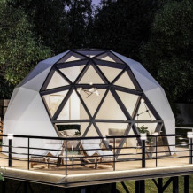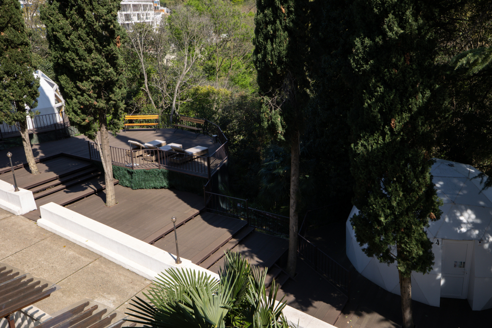Купольный домик под открытым небом с панорамным остеклением с двуспальной кроватью, раскладным креслом и террасой с лежаками с видом на парк Дендрарий.