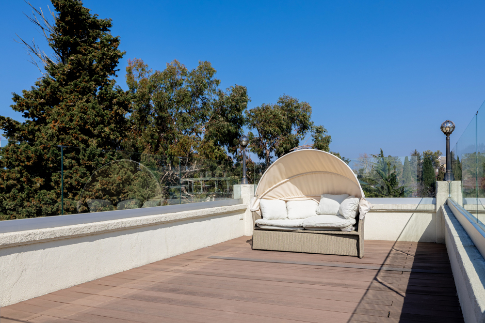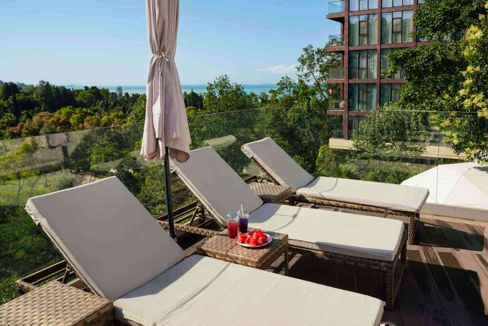 Роскошный двухкомнатный номер с двуспальной кроватью, двухместным раскладным диваном и балконом (или с двумя балконами) с видом на море и Дендрарий.