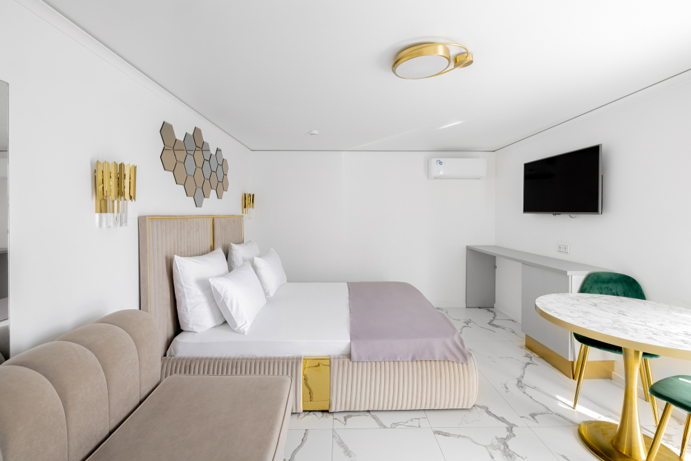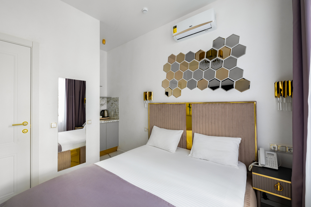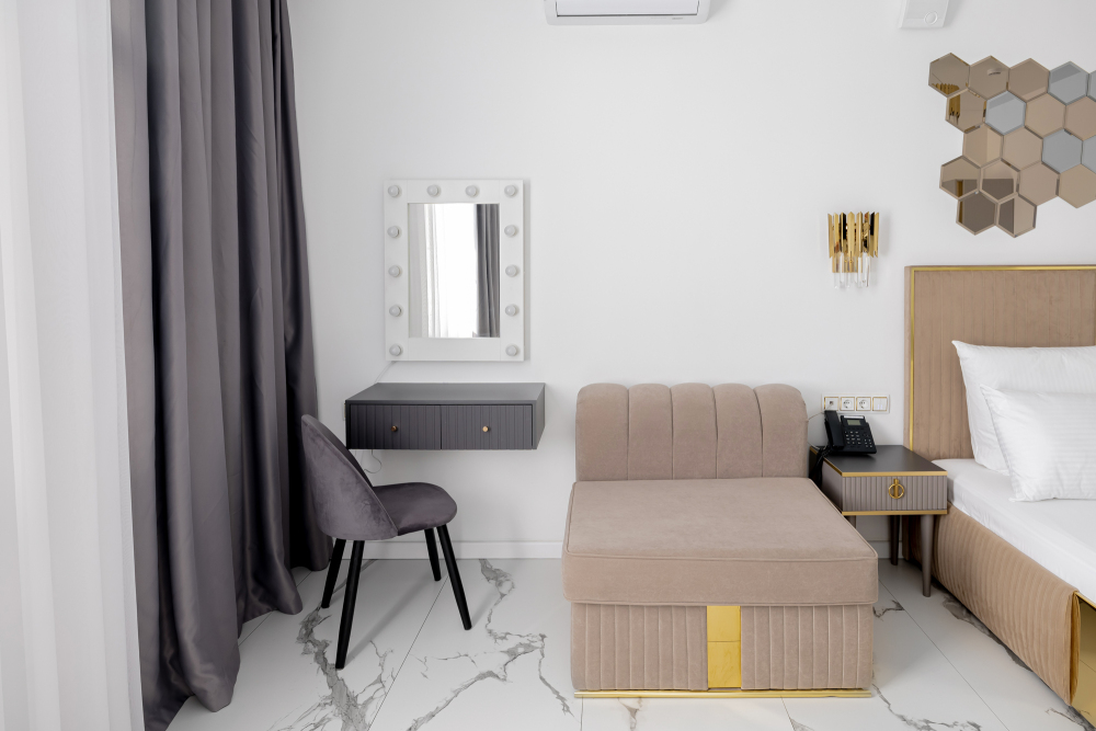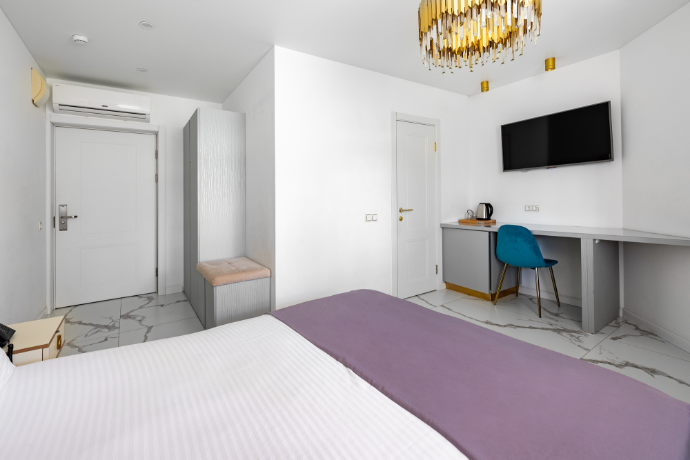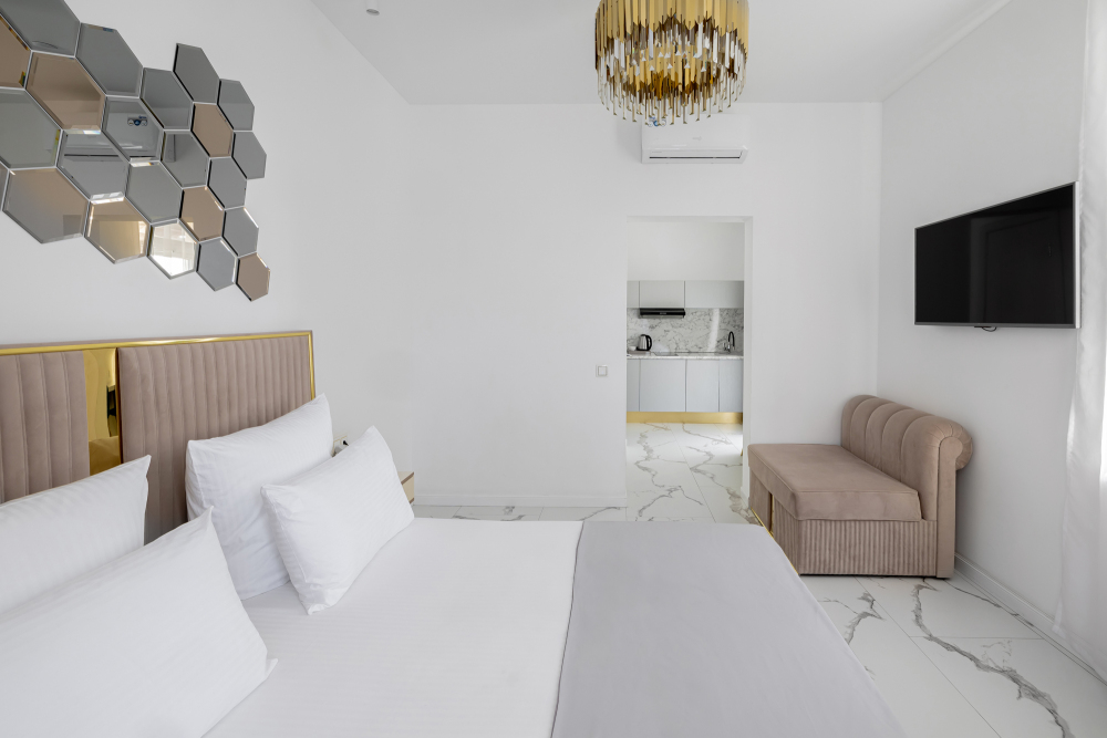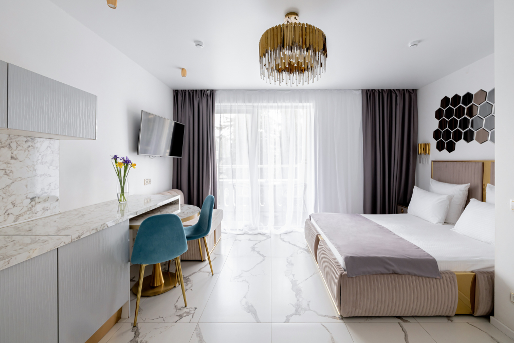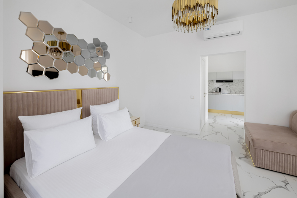 В номере — кондиционер, кухонный гарнитур с раковиной, чайник, мини-холодильник, сейф, шкаф, стол со стульями, телевизор. Номер оборудован собственной ванной комнатой, где гостей ожидают базовые косметические средства, полотенца, халаты и тапочки.