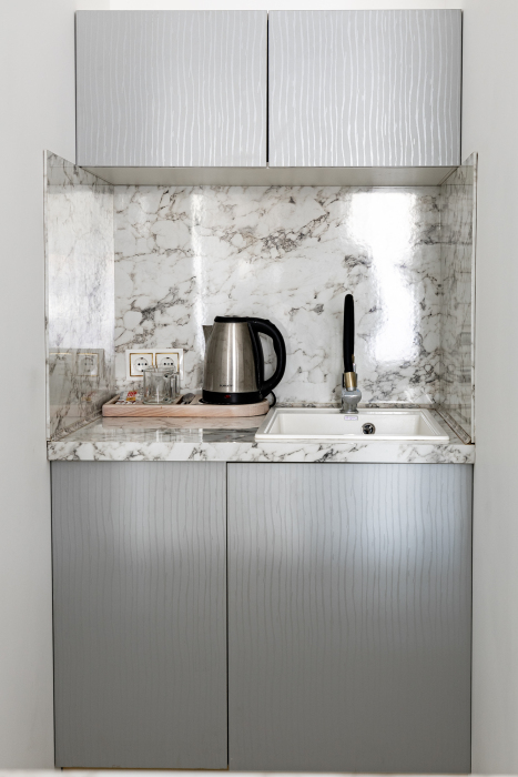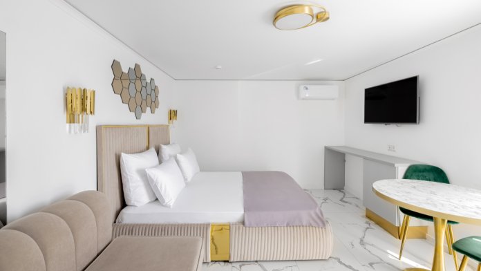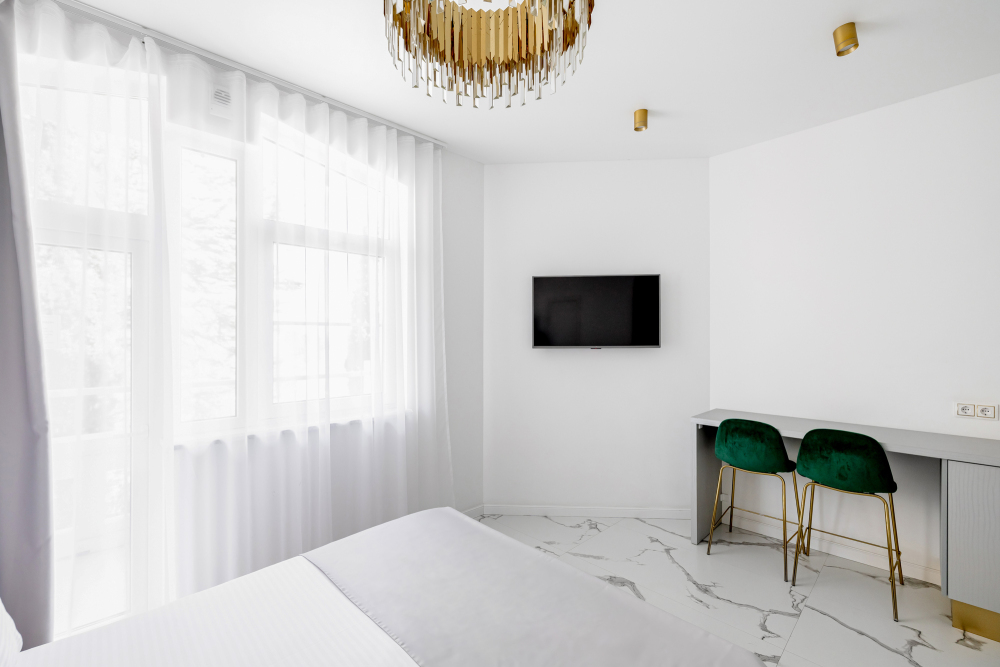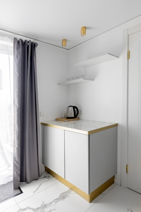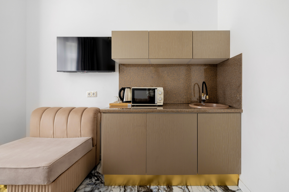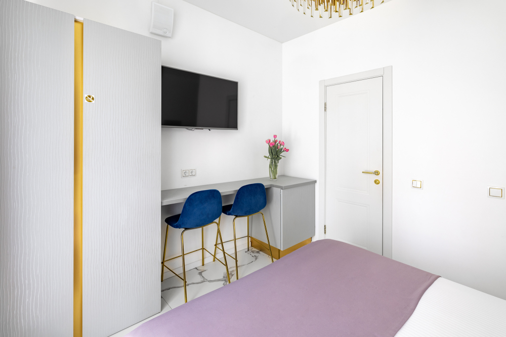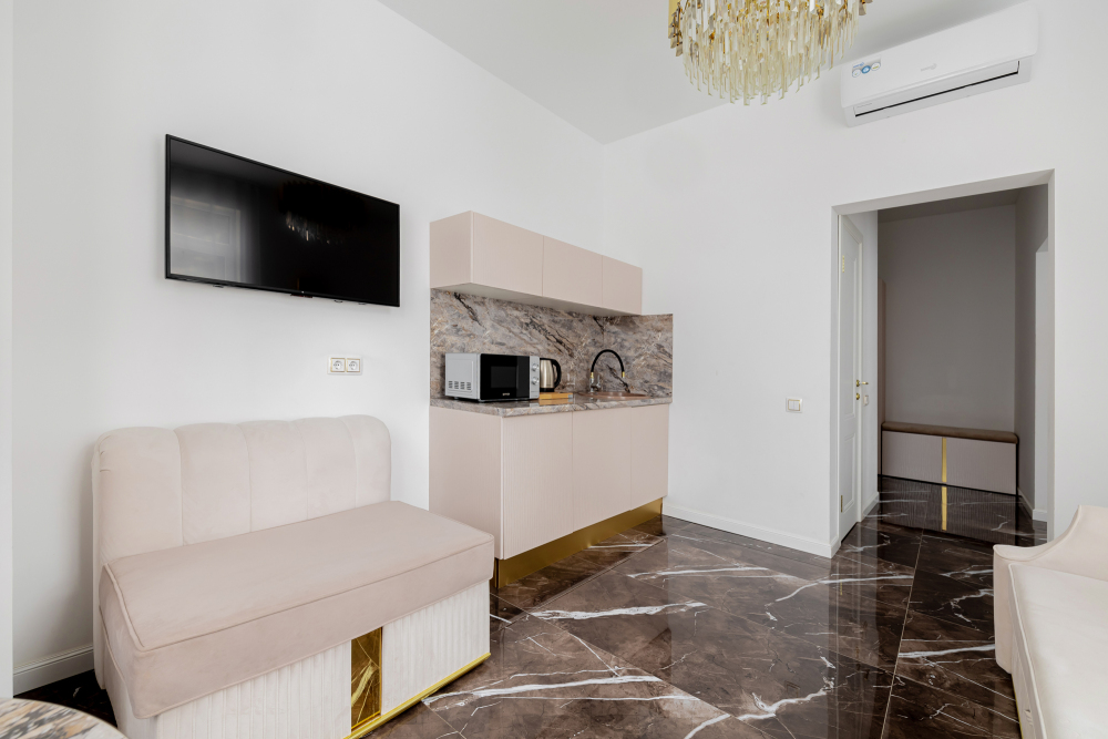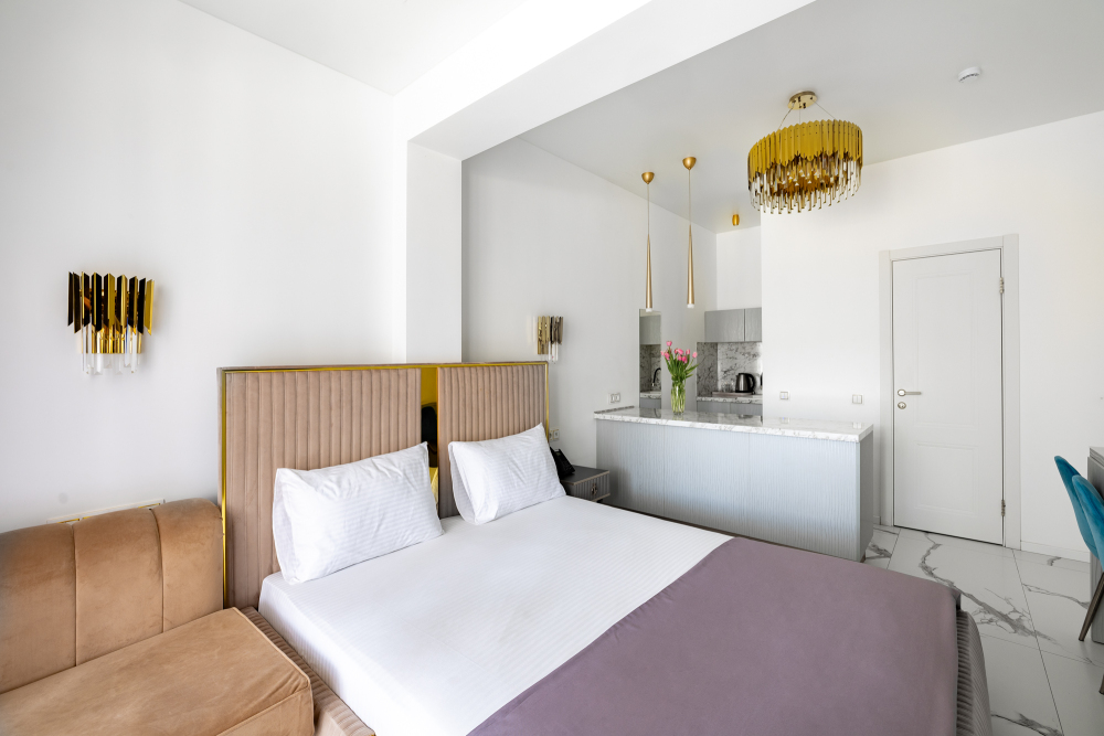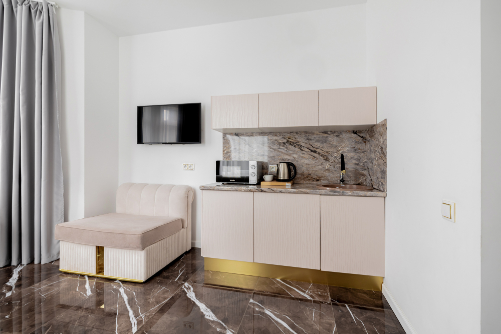 В номере — кондиционер, кухонный гарнитур с раковиной, чайник, мини-холодильник, сейф, шкаф, стол со стульями, телевизор. Номер оборудован собственной ванной комнатой, где гостей ожидают базовые косметические средства, полотенца, халаты и тапочки.