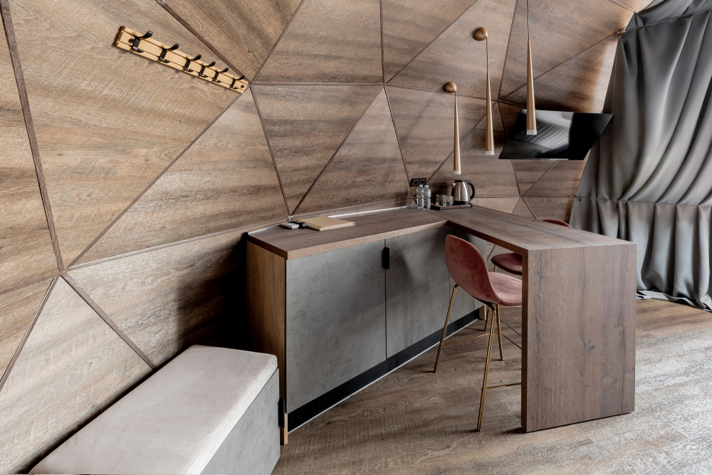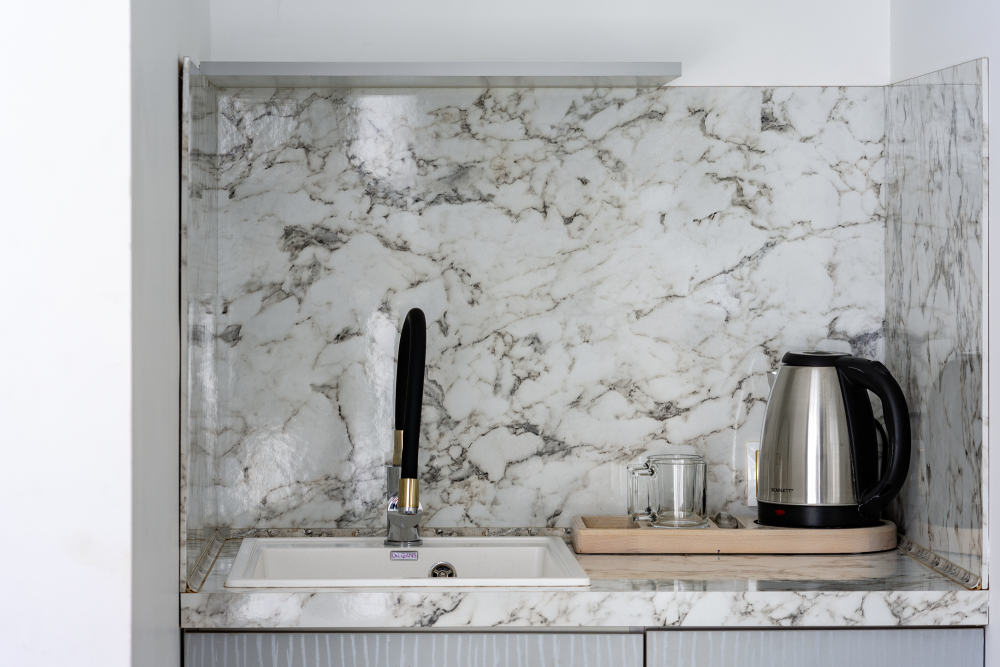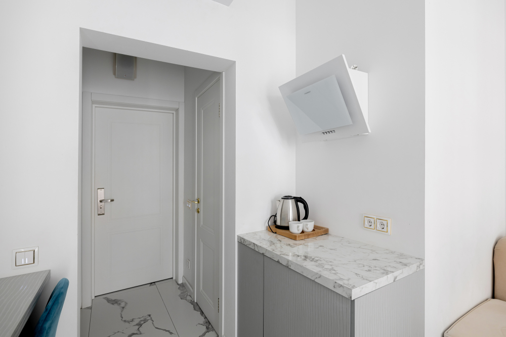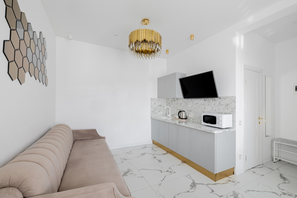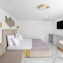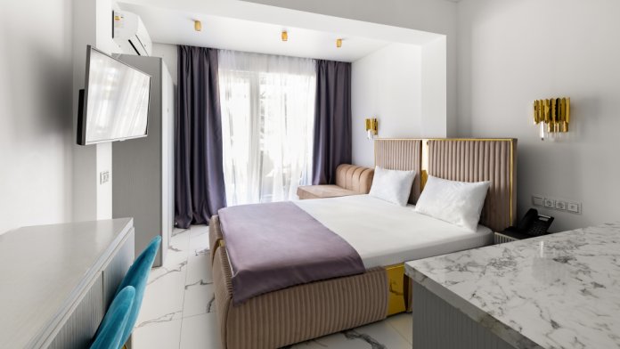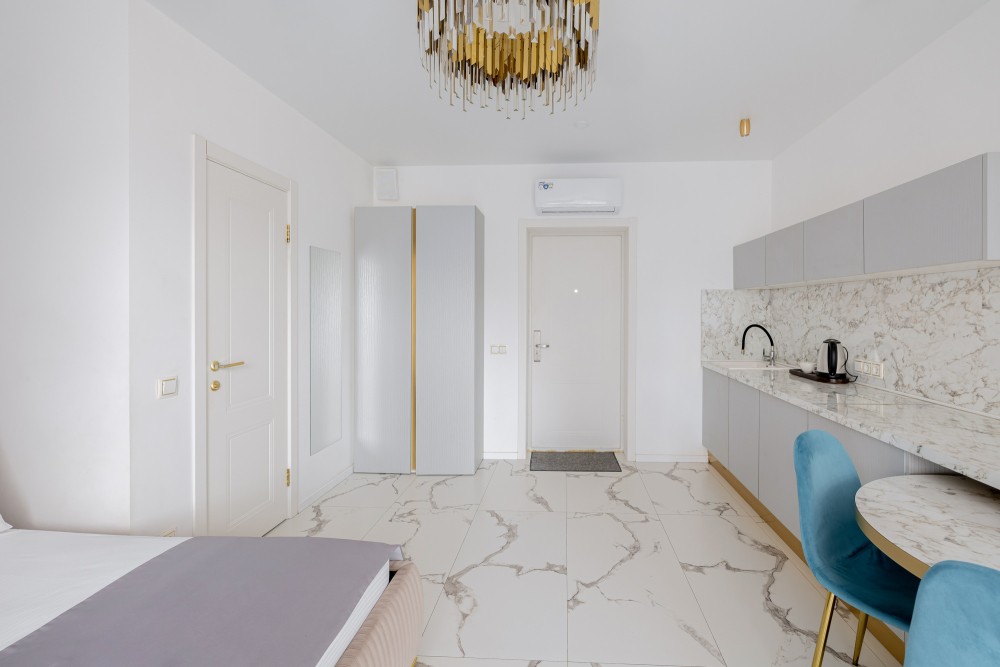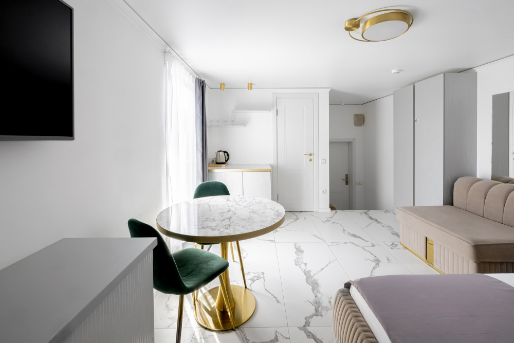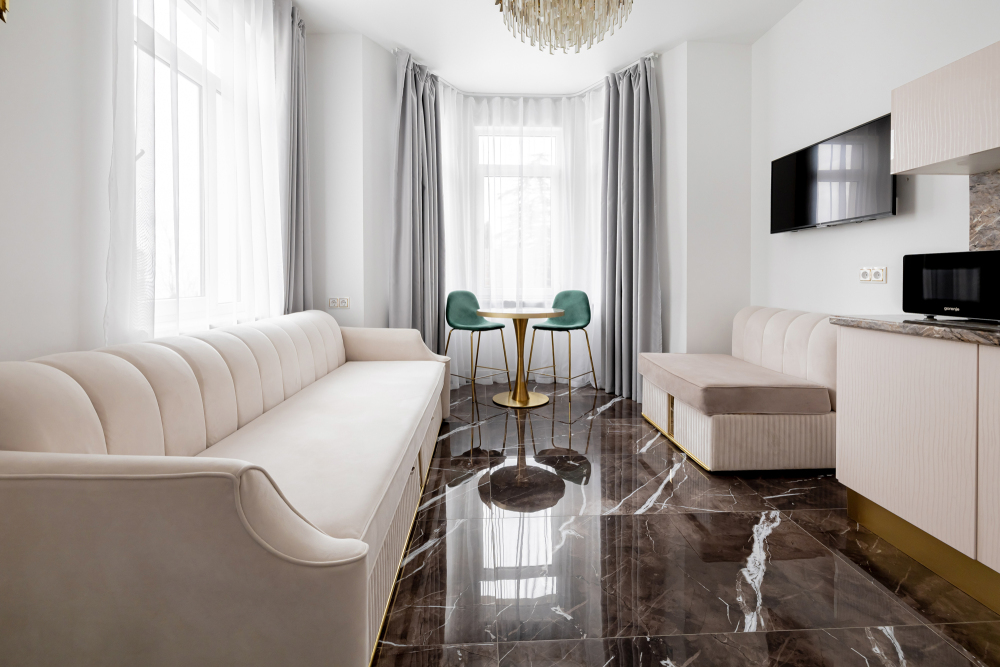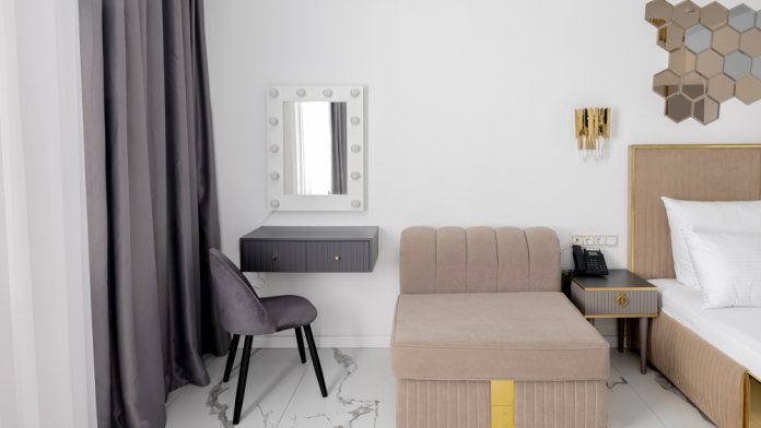 В номере — кондиционер, кухонный гарнитур с раковиной, чайник, мини-холодильник, сейф, шкаф, стол со стульями, телевизор. Номер оборудован собственной ванной комнатой, где гостей ожидают базовые косметические средства, полотенца, халаты и тапочки.