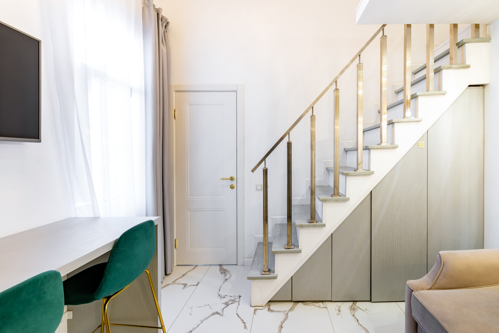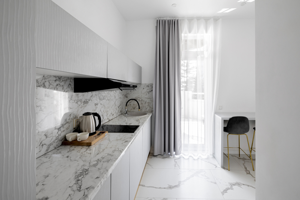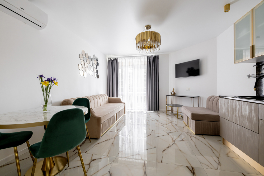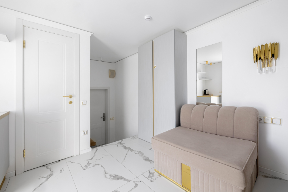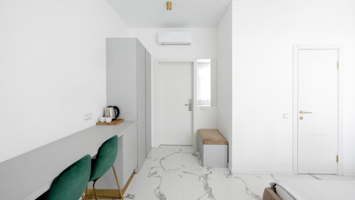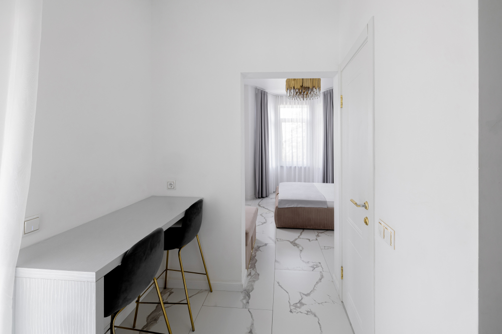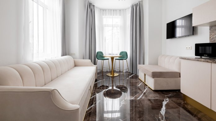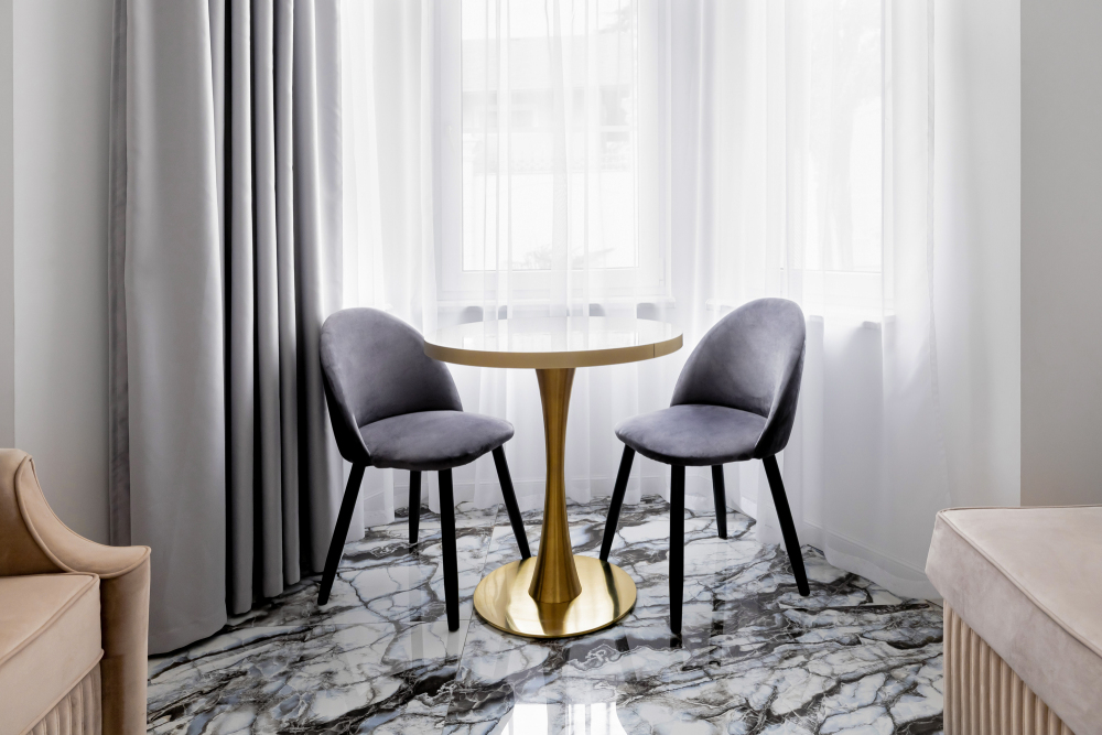В номере — кондиционер, кухонный гарнитур с раковиной, чайник, мини-холодильник, сейф, шкаф, стол со стульями, телевизор. Номер оборудован собственной ванной комнатой, где гостей ожидают базовые косметические средства, полотенца, халаты и тапочки.