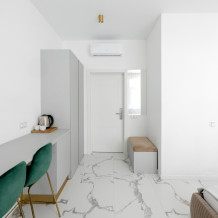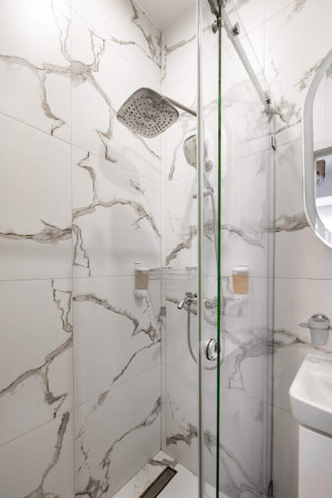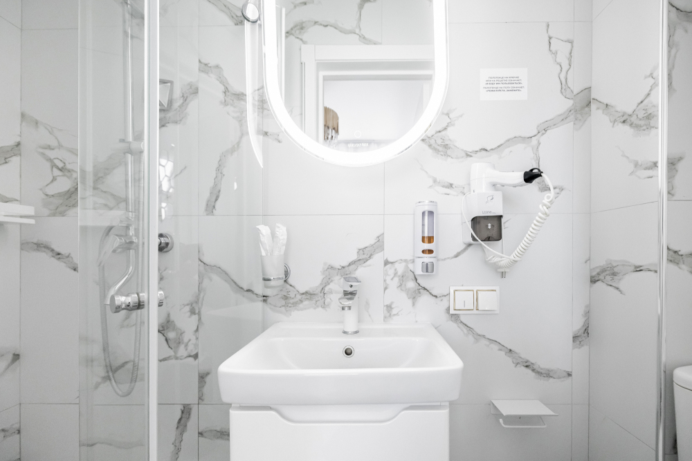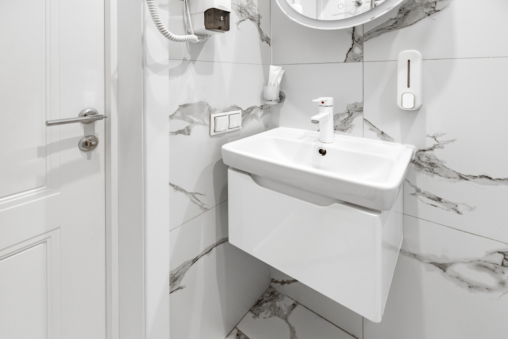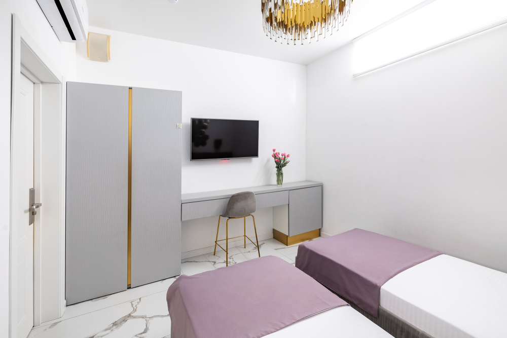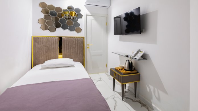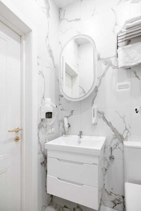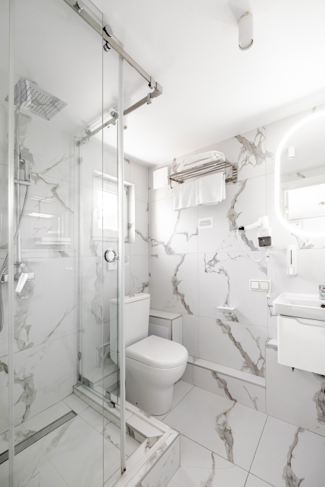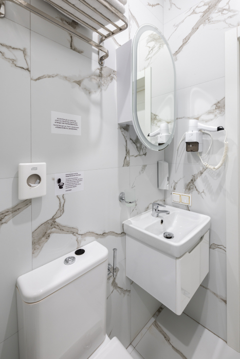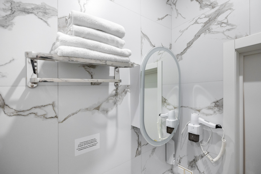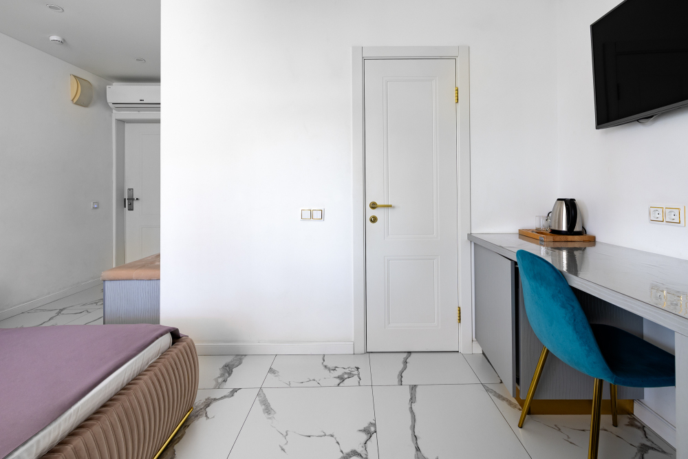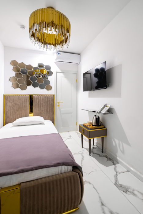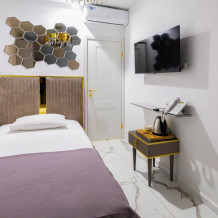 В комнате — кондиционер, раковина, чайник, мини-холодильник, сейф, шкаф, стол со стульями, телевизор. Номер оборудован собственной ванной комнатой, где гостей ожидают базовые косметические средства, полотенца, халаты и тапочки.