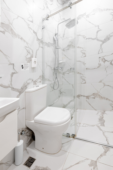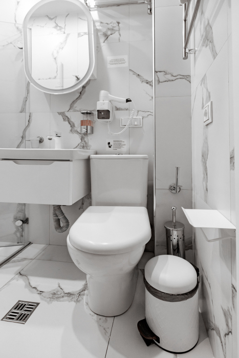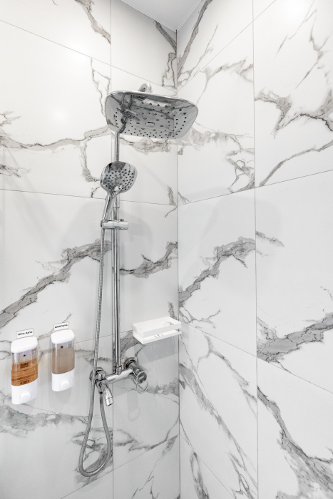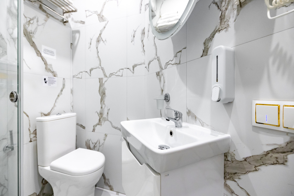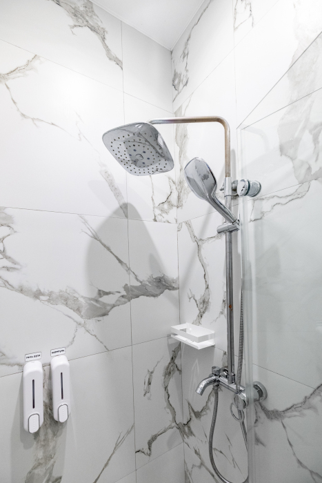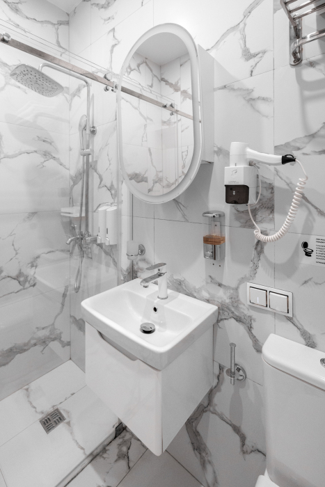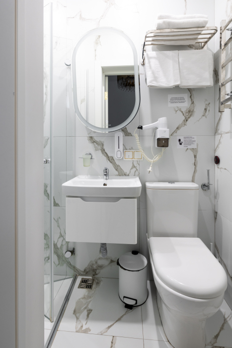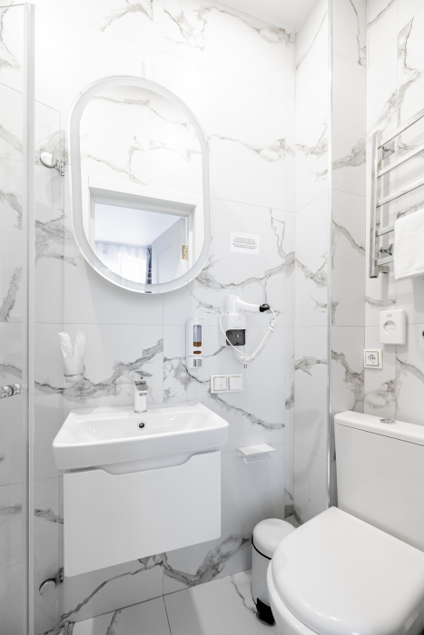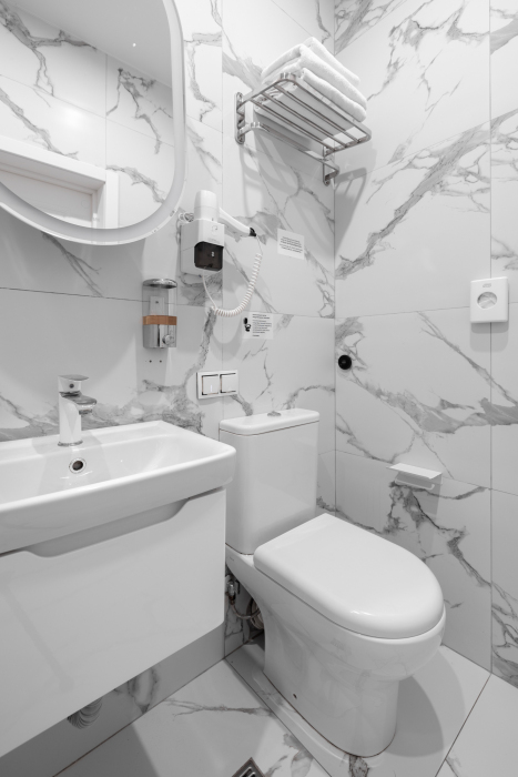 В комнате — кондиционер, чайник, мини-холодильник, сейф, шкаф, стол со стульями, телевизор. Номер оборудован собственной ванной комнатой, где гостей ожидают базовые косметические средства, полотенца, и тапочки.