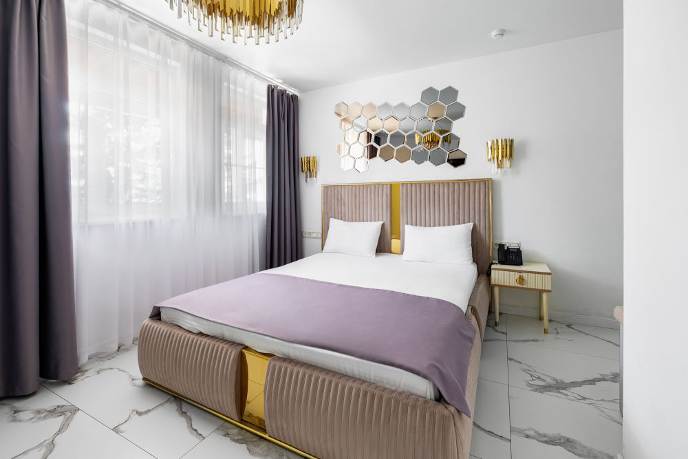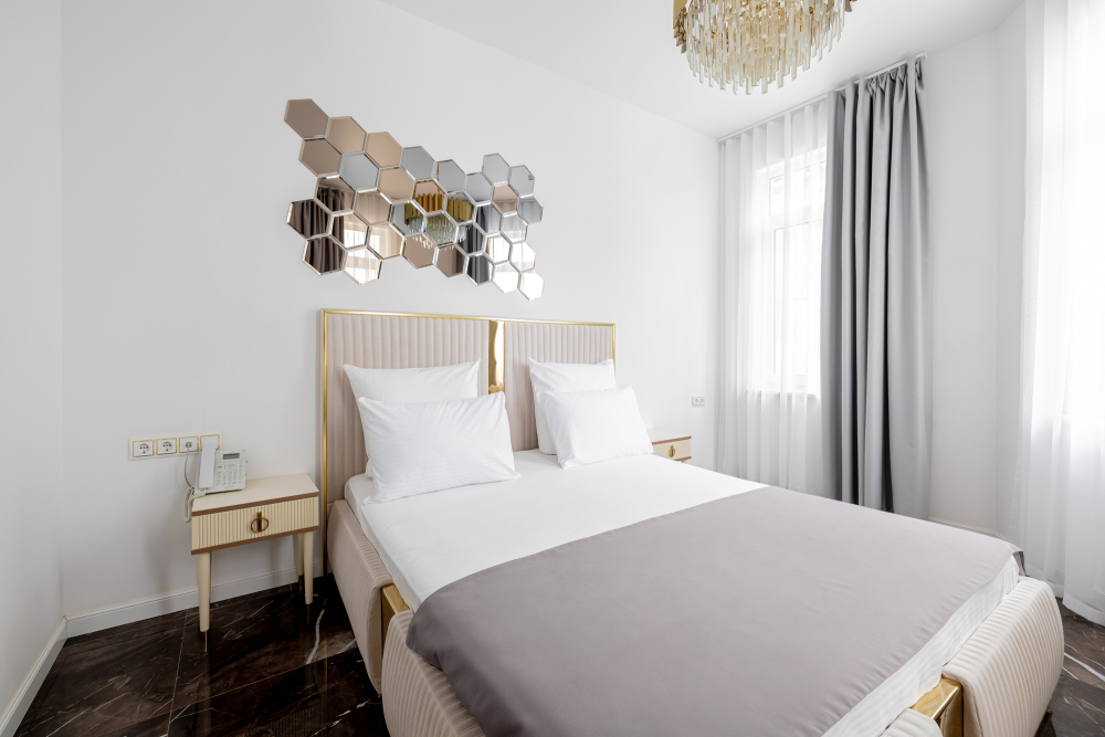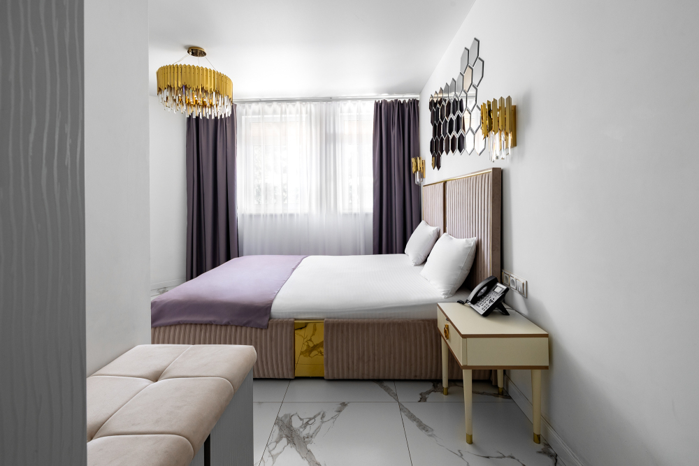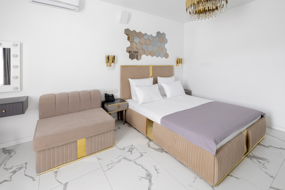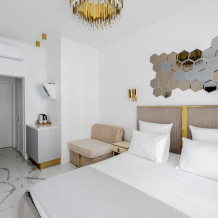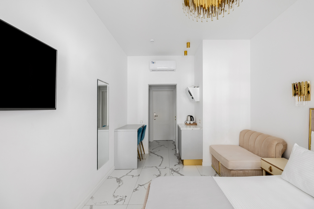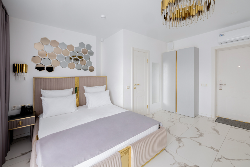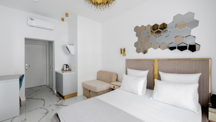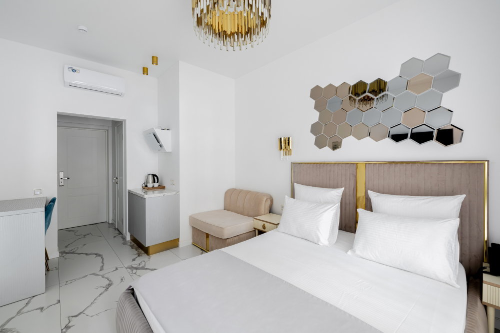 Все номера отеля с дизайнерским интерьером и оборудованы современными ТВ, сплит-системами, сейфами, холодильниками, шкафами для хранения одежды, сейфами и комфортными кроватями. В каждом номере индивидуальная ванная комната с душевой кабиной, набором полотенец, феном и полным набором гигиенических принадлежностей. Каждому гостю предоставляется завтрак на выбор из сет-меню.