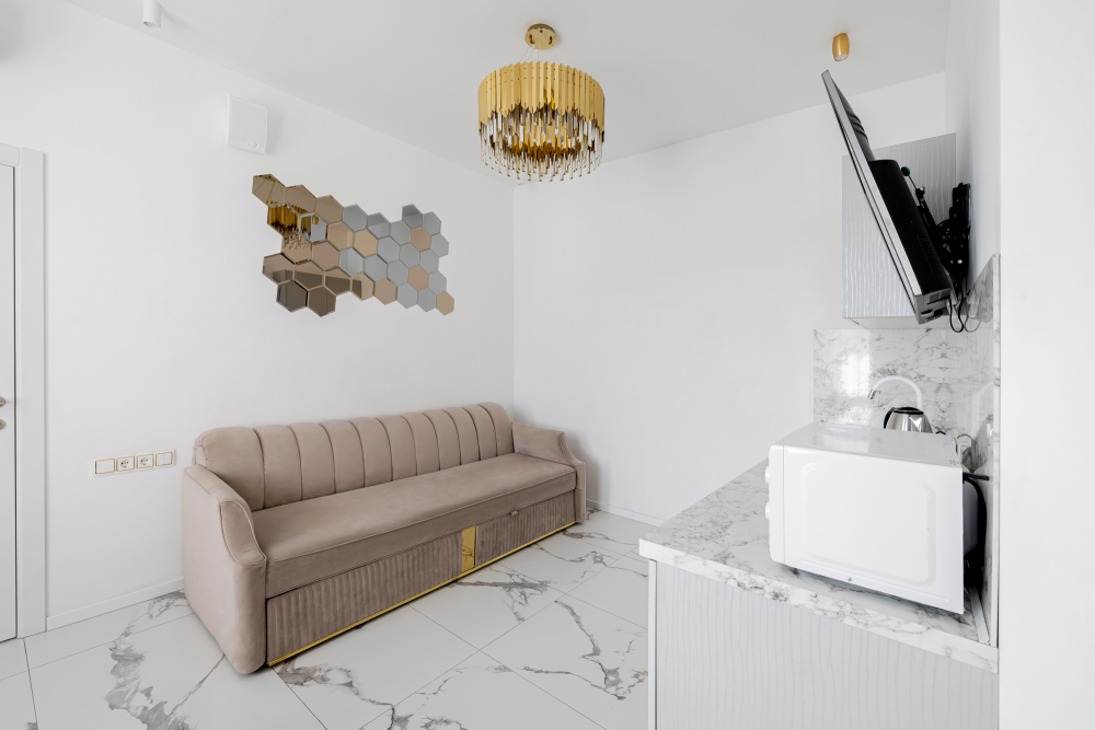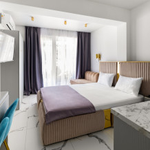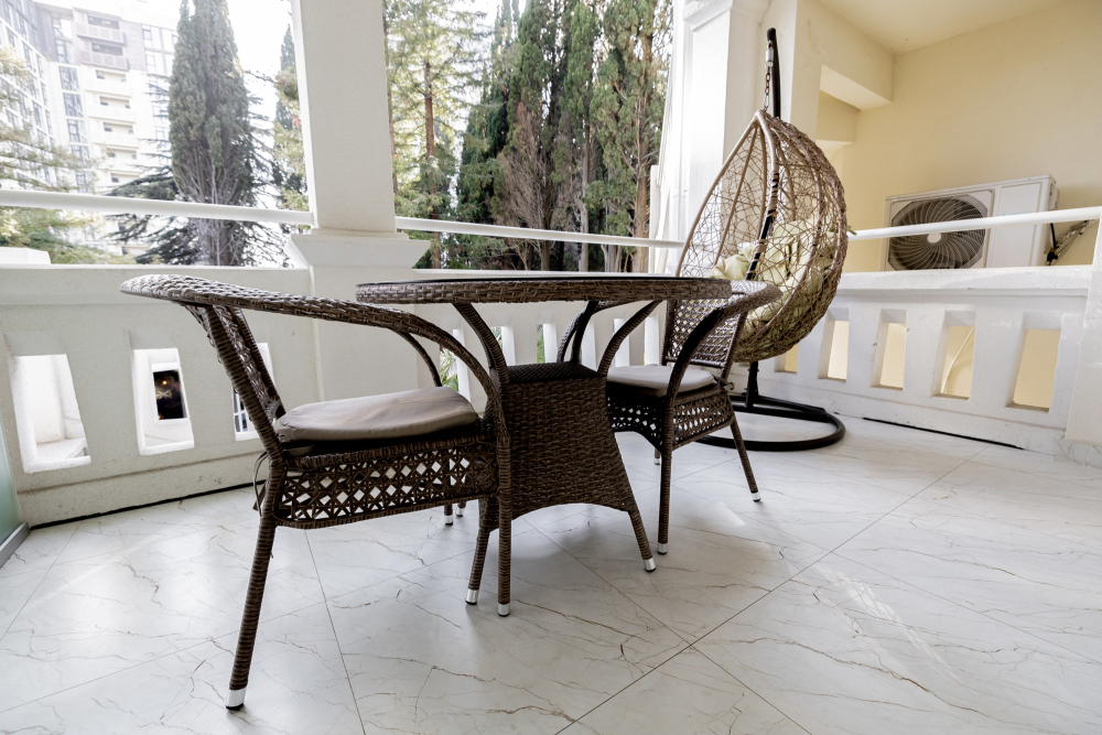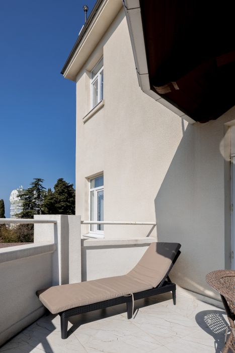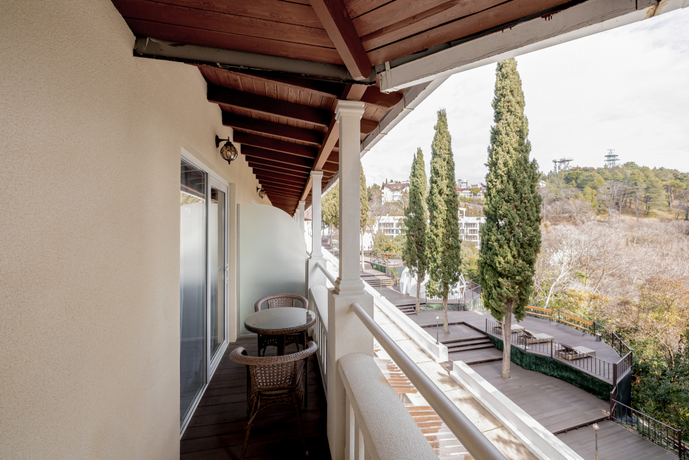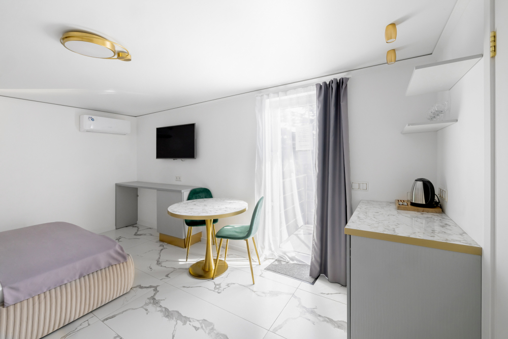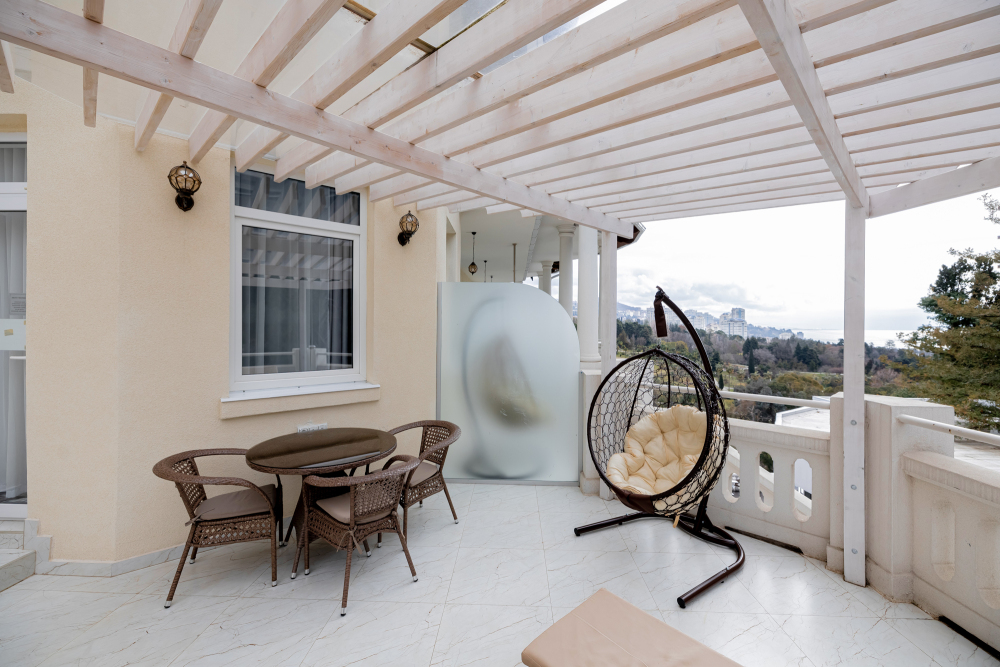 Просторный однокомнатный номер повышенной комфортности с одной двуспальной кроватью, раскладным креслом, и балконом с видом на море и парк Дендрарий.