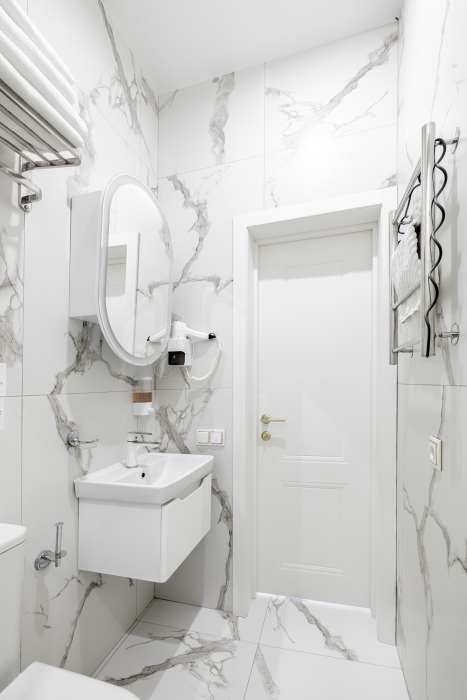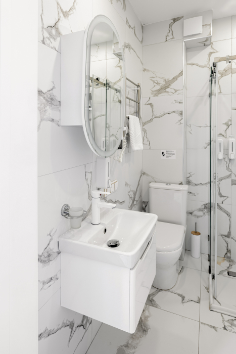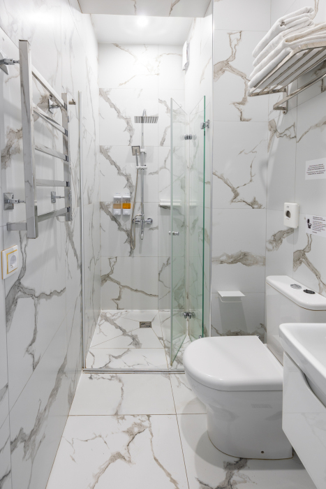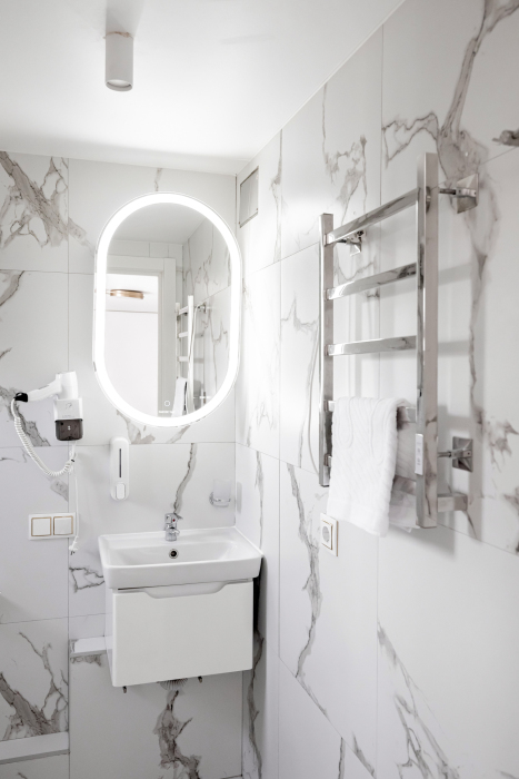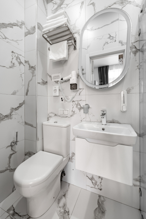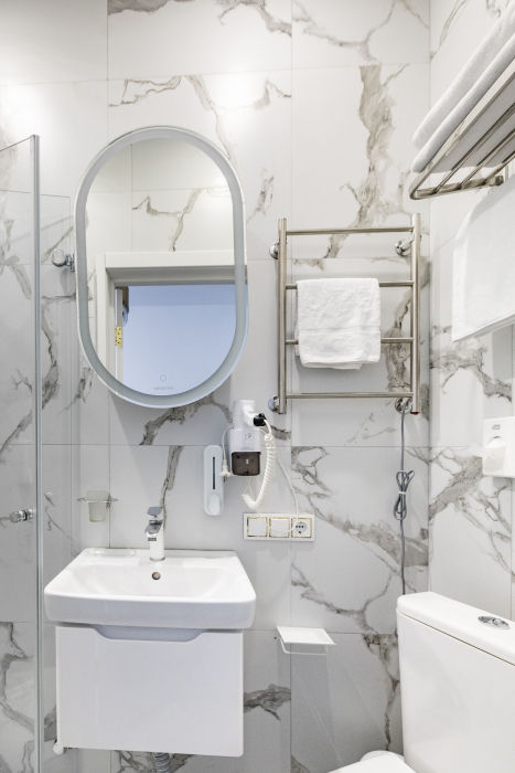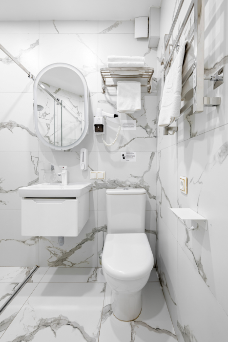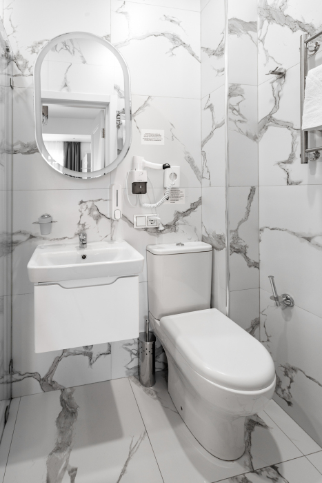 В комнате — кондиционер, чайник, мини-холодильник, сейф, шкаф, стол со стульями, телевизор. Номер оборудован собственной ванной комнатой, где гостей ожидают базовые косметические средства, полотенца, халаты и тапочки.