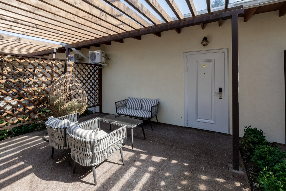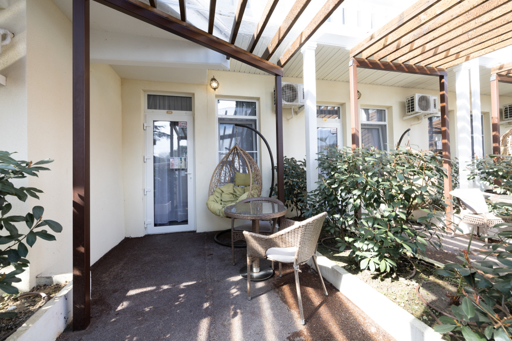 Комфортный однокомнатный номер с одной двуспальной кроватью, раскладным креслом и террасой.