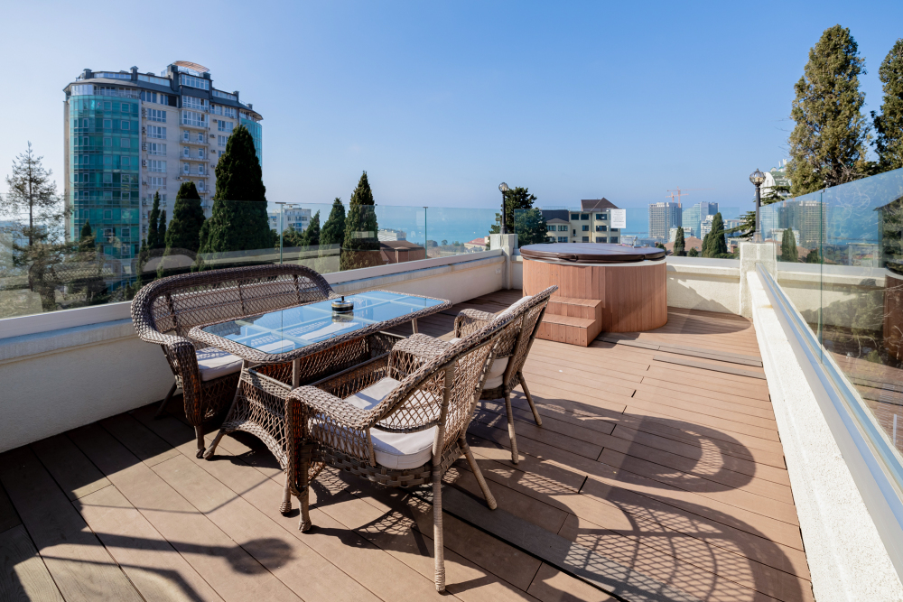 Очень комфортный оборудованный кухонной зоной двухкомнатный номер с двуспальной кроватью, двухместным раскладным диваном, креслом-кроватью и с собственной террасой с джакузи.