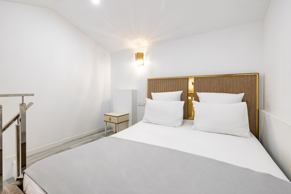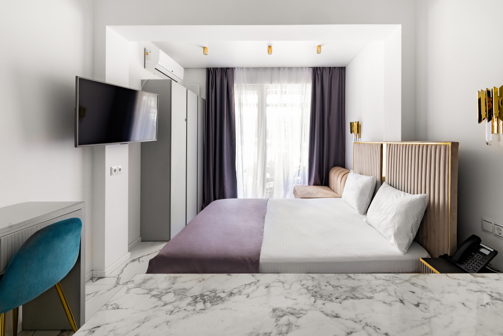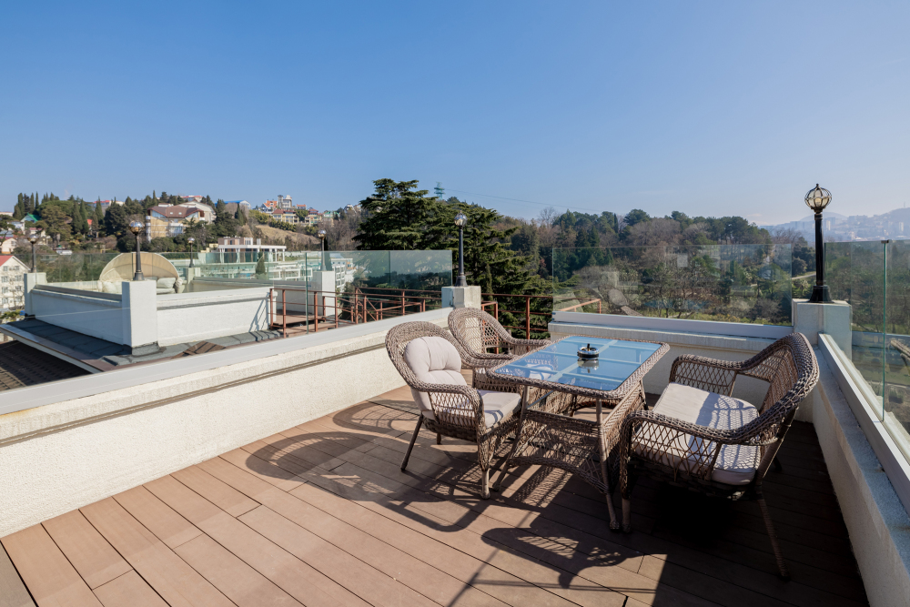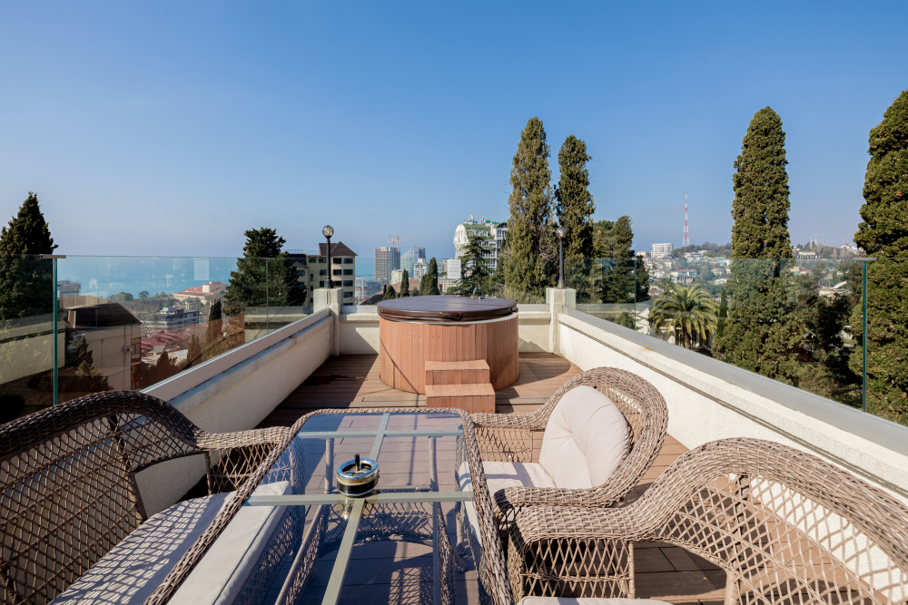 Изящный однокомнатный номер с двуспальной кроватью, раскладным креслом и выходом на собственную террасу с джакузи с панорамным видом на море и город.