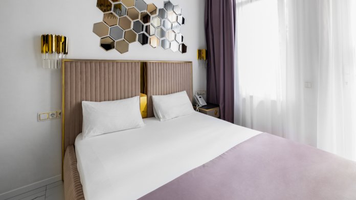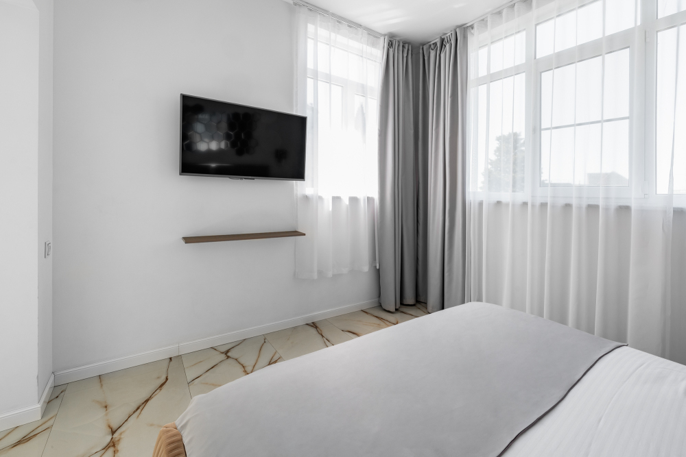 Уютный однокомнатный номер с одной двуспальной кроватью и красивым видом из окна.