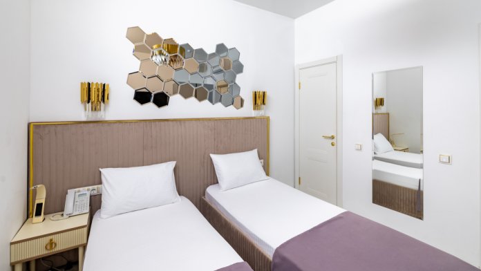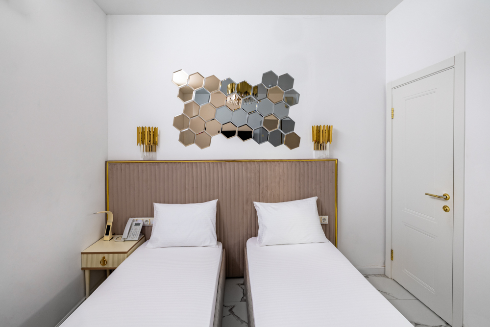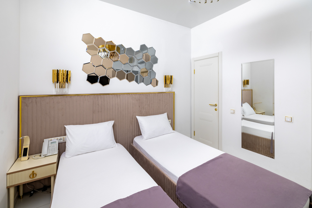 Уютный однокомнатный номер с двумя односпальными кроватями.