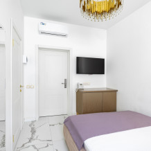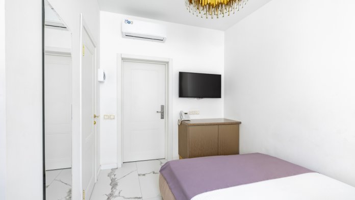 В комнате — кондиционер, чайник, мини-холодильник, сейф, телевизор. Номер оборудован собственной ванной комнатой, где гостей ожидают базовые косметические средства, полотенца, и тапочки.