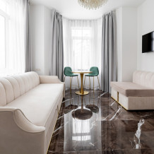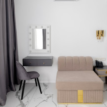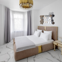 Комфортный однокомнатный номер с двуспальной кроватью (номер может быть как с антресолью так и обычный одноэтажный), двухместным раскладным диваном (или двумя раскладными креслами) и окнами с видом на парк Дендрарий.