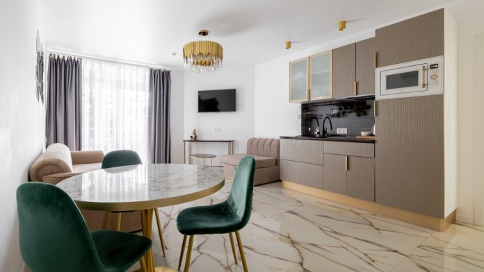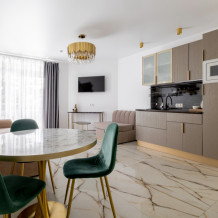 Очень комфортный оборудованный кухонной зоной двухкомнатный номер с одной двуспальной кроватью и двухместным раскладным диваном.