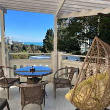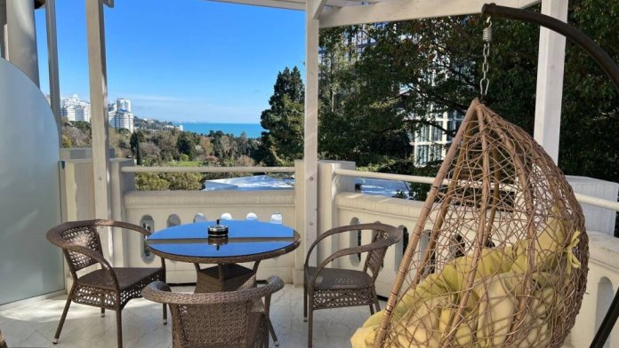 Просторный однокомнатный номер с одной двуспальной кроватью, раскладным креслом и балконом или лаунж зоной с видом на море и парк Дендрарий.