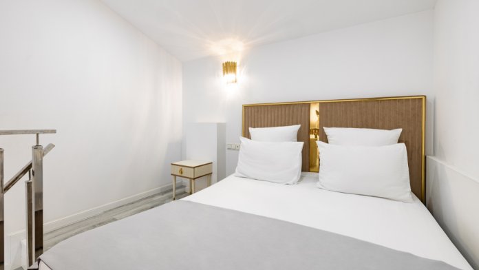 Уютный однокомнатный номер с одной двуспальной кроватью с небольшой террасой.