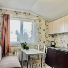 Кухня в апартаментах полностью оборудована всем необходимым: большой холодильник, индукционная плита, микроволновка, чайник и полный набор посуды и удобная обеденная мебель. Вы почувствуете себя как дома, имея все необходимое под рукой. Современный санузел с душем, стиральная машинка в каждом апартаменте. Также есть гладильная доска, утюг, сушилки для белья.
