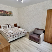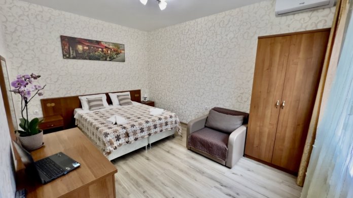 Новые просторные апартаменты от 32 кв.м. в семейном апарт-отеле. В студии двуспальная кровать или 2 раздельные с шикарными матрасами. Доп. спальное место раскладное кресло или диван. А также шкаф, тумбочки, трюмо с зеркалом, ТВ, кондиционер, фен.