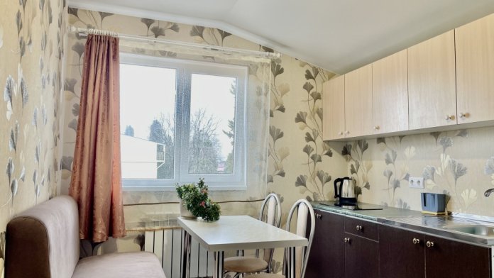 Новая 2-комнаятная квартира 45 кв.м. в семейном апарт-отеле. Спальня с двуспальной или 2 раздельными кроватями. Для всех гостей белоснежное постельное белье и набор полотенец. А также шкаф, тумбочки, трюмо с зеркалом, ТВ, кондиционер, фен. Раскладной диван для 1-2 взрослых или детей (стоит в спальне или кухне. Кухня в каждой квартире полностью оборудована всем необходимым: большой холодильник, индукционная плита, микроволновка, чайник и полный набор посуды. Вы почувствуете себя как дома, имея все необходимое под рукой. Современный санузел с душем, стиральная машина в каждой квартире.