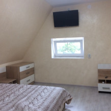 На первом этаже: две отдельные комнаты, оборудованные двухспальной кроватью, телевизором с интернетом, кондиционером, шкаф, комод, прикроватные тумбы, постельное, покрывала, одеяла, подушки. Ванная комната: душ, бойлер, унитаз и беде. А так же есть кухня-студия: варочная поверхность, вся необходимая посуда, стол на шесть персон, удобные стулья.