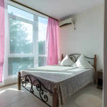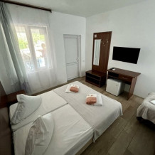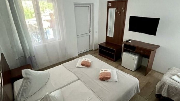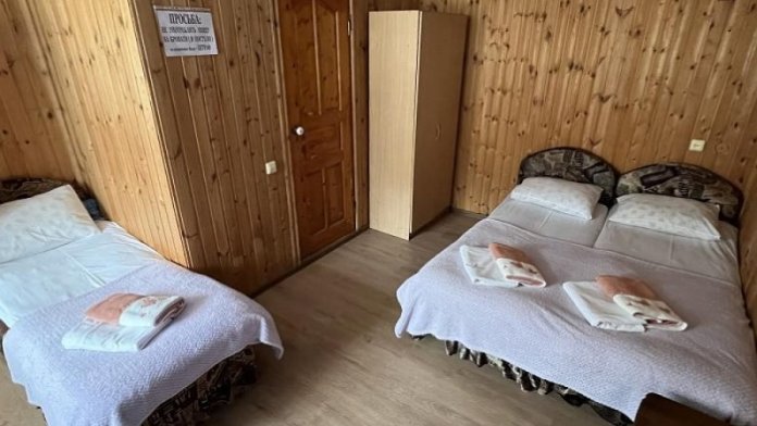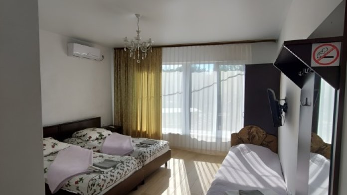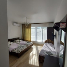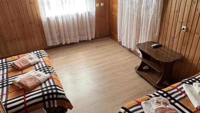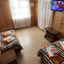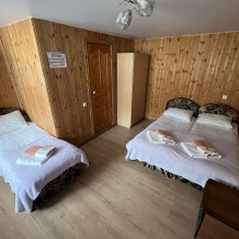 Номер «Эконом». Мебель, две односпальные кровати. Телевизор, вентилятор, полотенца на каждого гостя. Санузел общий ещё на один номер «Эконом». (Душ,туалет раздельные). Кухня и холодильник рядом, на втором этаже.