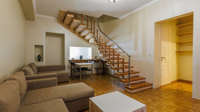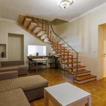 Номера данной категории являются двухэтажными, На первом этаже расположена гостиная с большим диваном и обеденной зоной, на втором этаже расположена спальня с двуспальной кроватью.