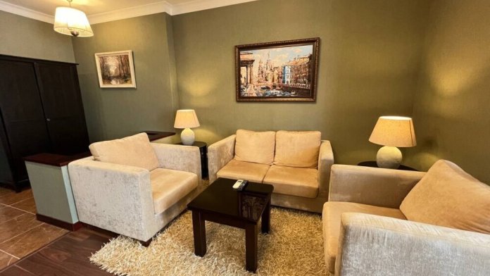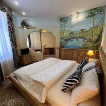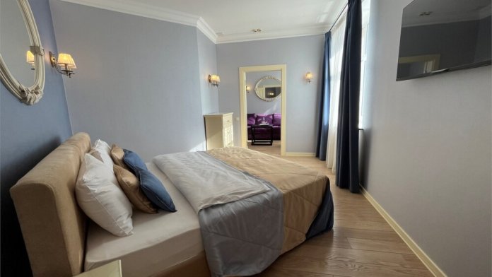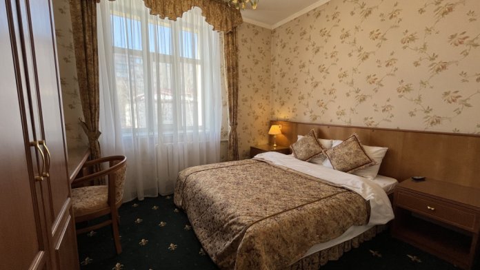 Удобный номер площадью 35 кв. метров, рассчитан максимум на 4-х селовек.. Номер удобно разделен на 2 комнаты : спальную и гостиную. В номере большая двухспальная кровать, заправленная чистым постельным бельем,и дополнительное размещение в виде раскладного дивана, мягкая мебель. Для вашего удобства номер оснащен кондиционером, сейфом, шкафом, тумбой, телевизором. Ванная комната оборудована душевой кабиной. феном, каждому гостю выдается 3 полотенца, шампунь, гель для душа и мыло