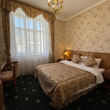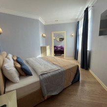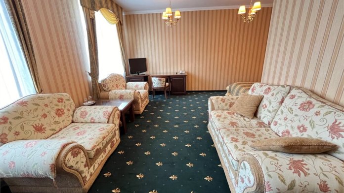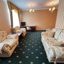 Удобный номер площадью 35 кв. метров для одного - двоих человек. Номер удобно разделен на 2 комнаты : спальную и гостиную. В номере большая двухспальная кровать, заправленная чистым постельным бельем,мягкая мебель. Для вашего удобства номер оснащен кондиционером, сейфом, шкафом, тумбой, телевизором. Ванная комната оборудована душевой кабиной. феном, каждому гостю выдается 3 полотенца, шампунь, гель для душа и мыло