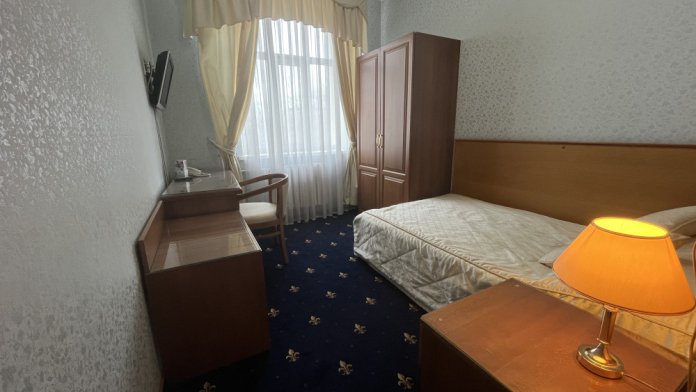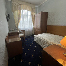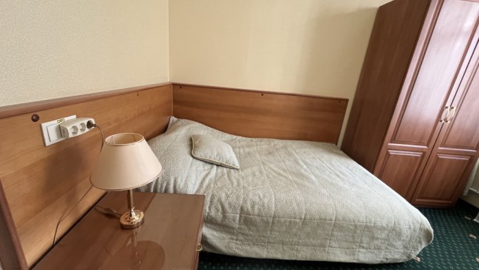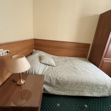 Удобный номер площадью 12 кв. метров для оного человека В номере односпальная удобная кровать, заправленная чистым постельным бельем. Для вашего удобства номер оснащен кондиционером, шкафом, тумбой, телевизором. Ванная комната оборудована душевой кабиной. каждому гостю выдается 3 полотенца, шампунь, гель для душа и мыло