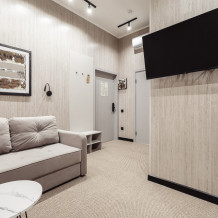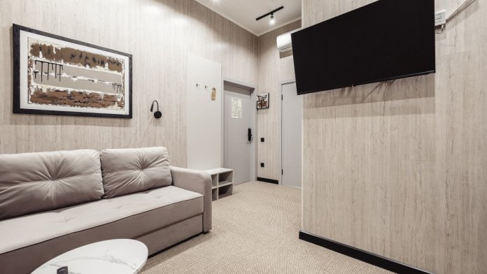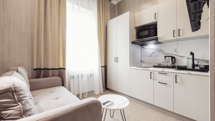 Номер с мини-кухней и раздвижным диваном. Душевая комната с теплым полом. Высокие потолки. Чайная станция, микроволновая печь.